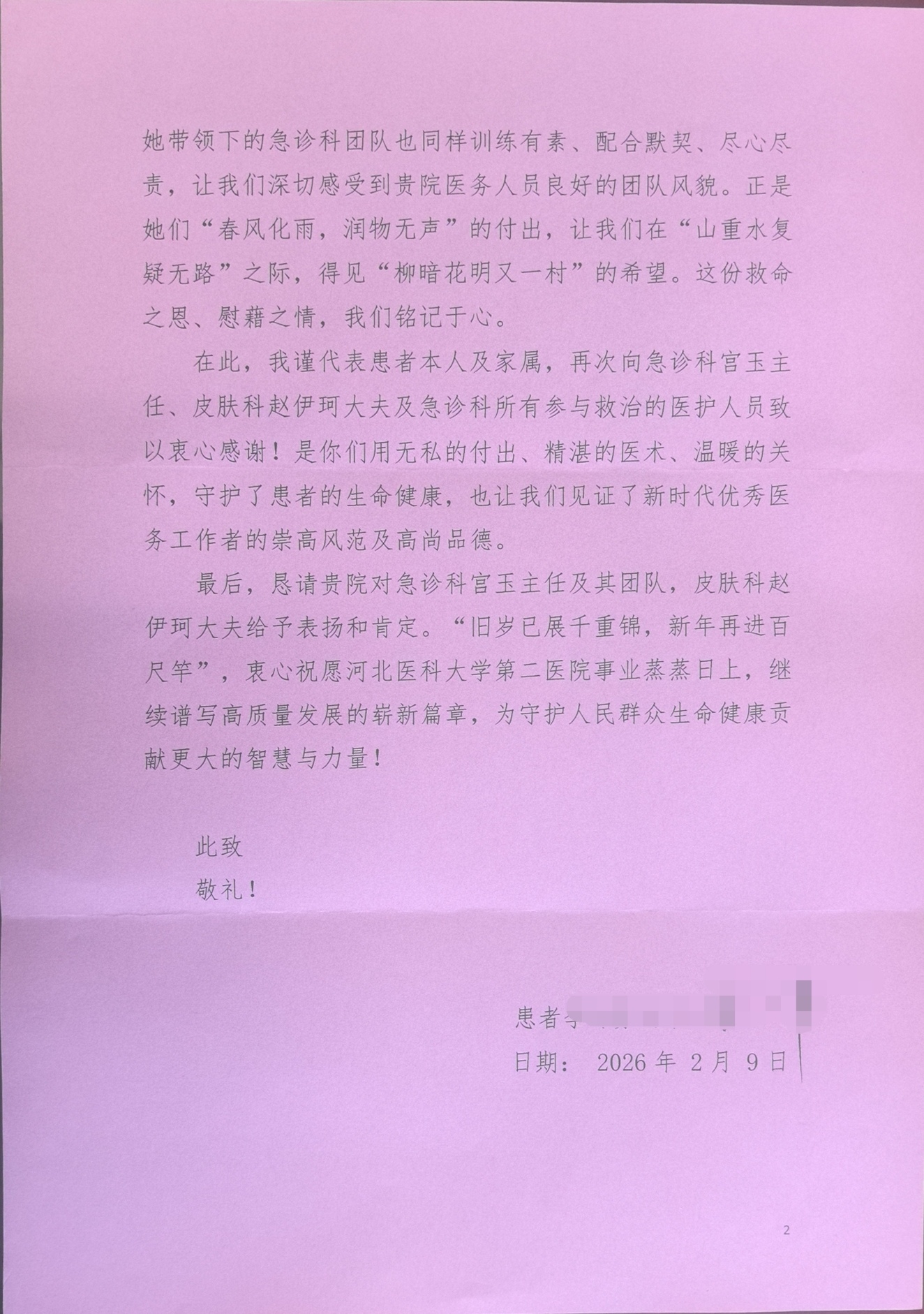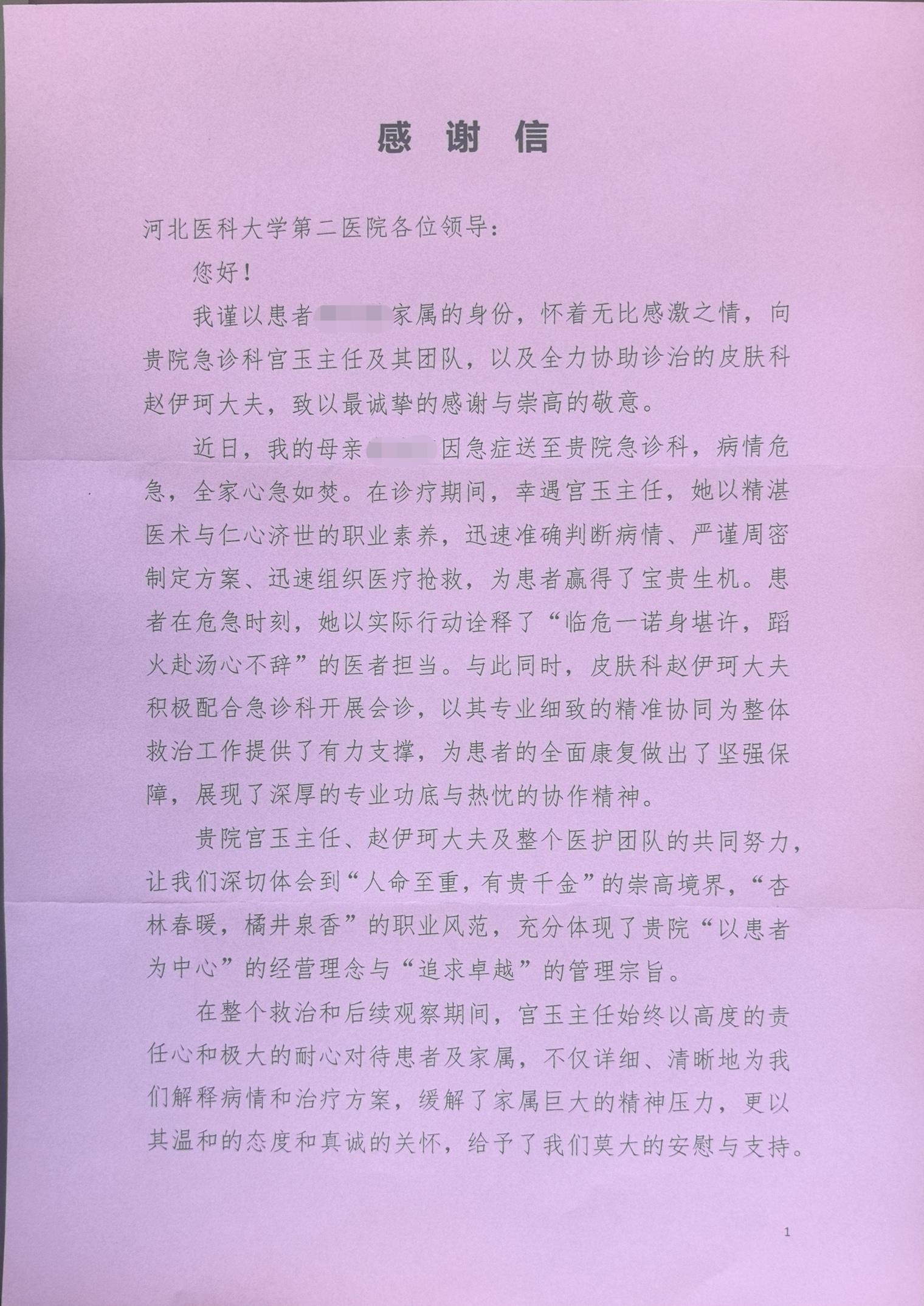 致急诊科宫玉主任及其团队、皮肤科赵伊珂医生的感谢信