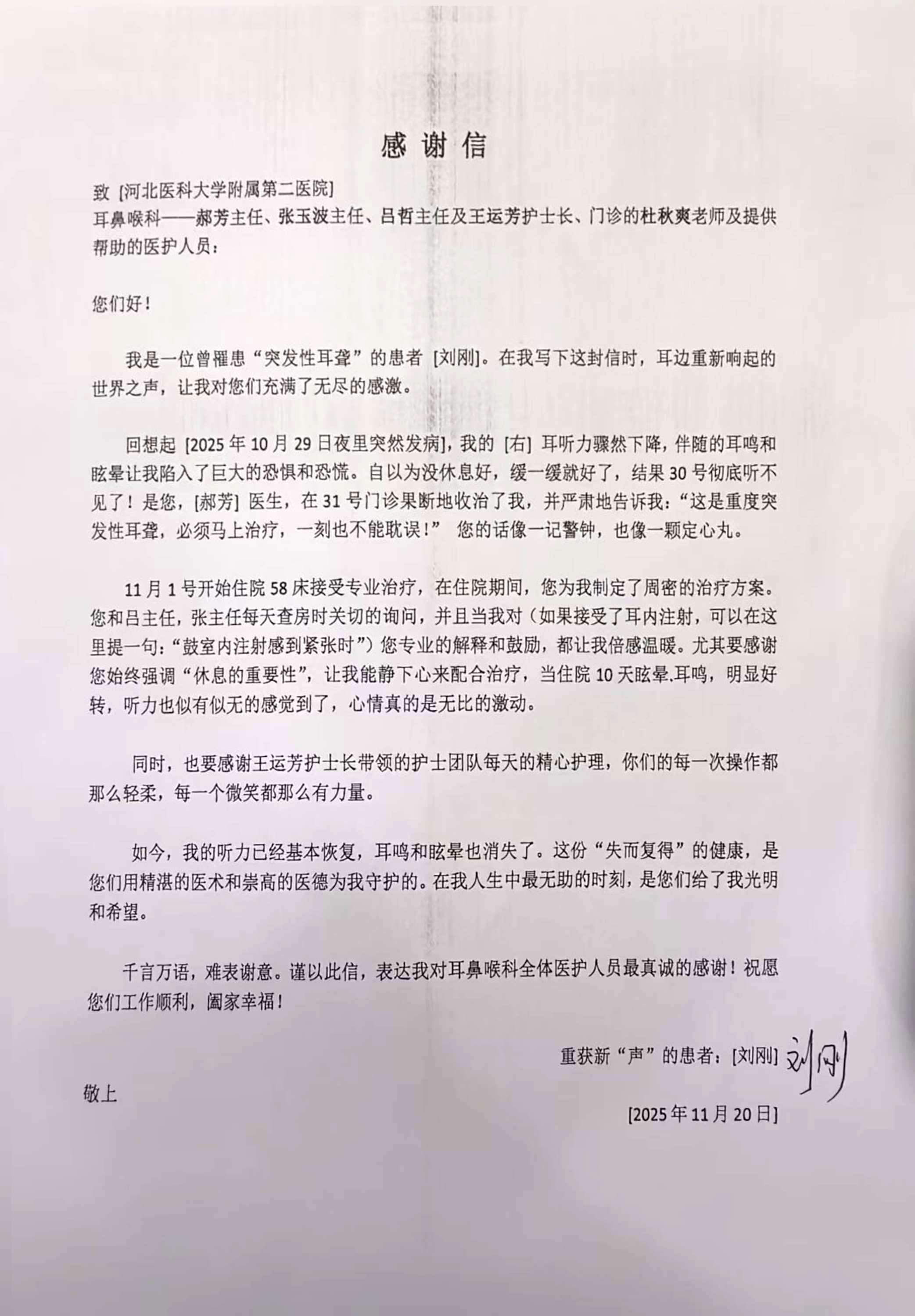 致耳鼻喉科郝芳主任、张玉波主任、吕哲主任、王运芳护士长、杜秋爽护士及全体医护人员的感谢信