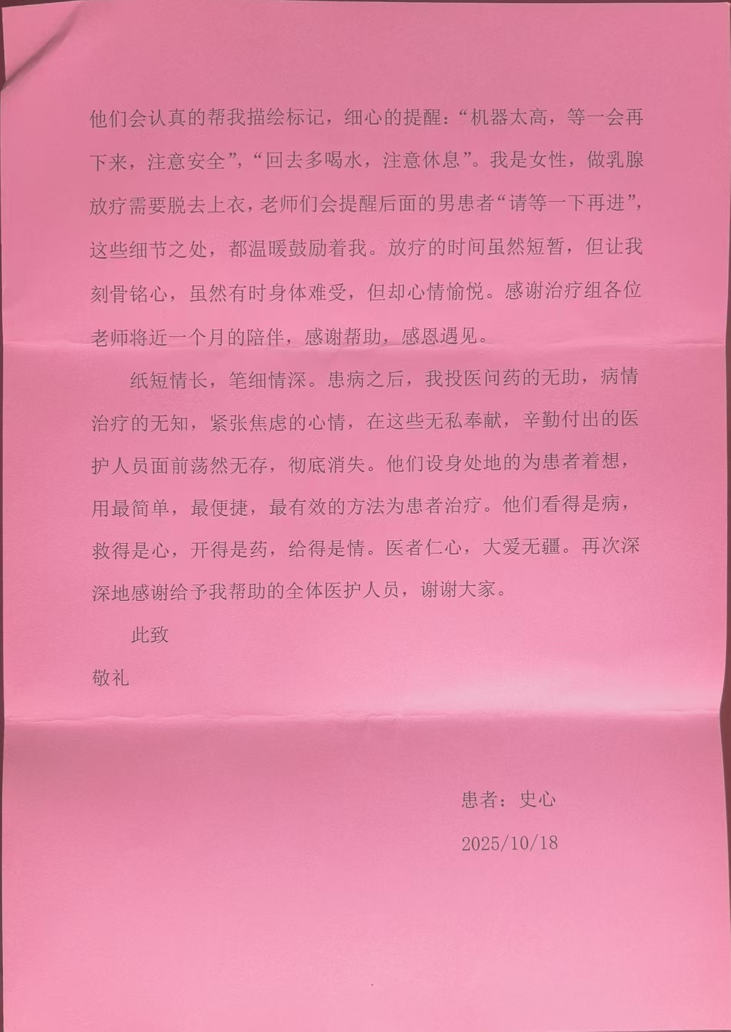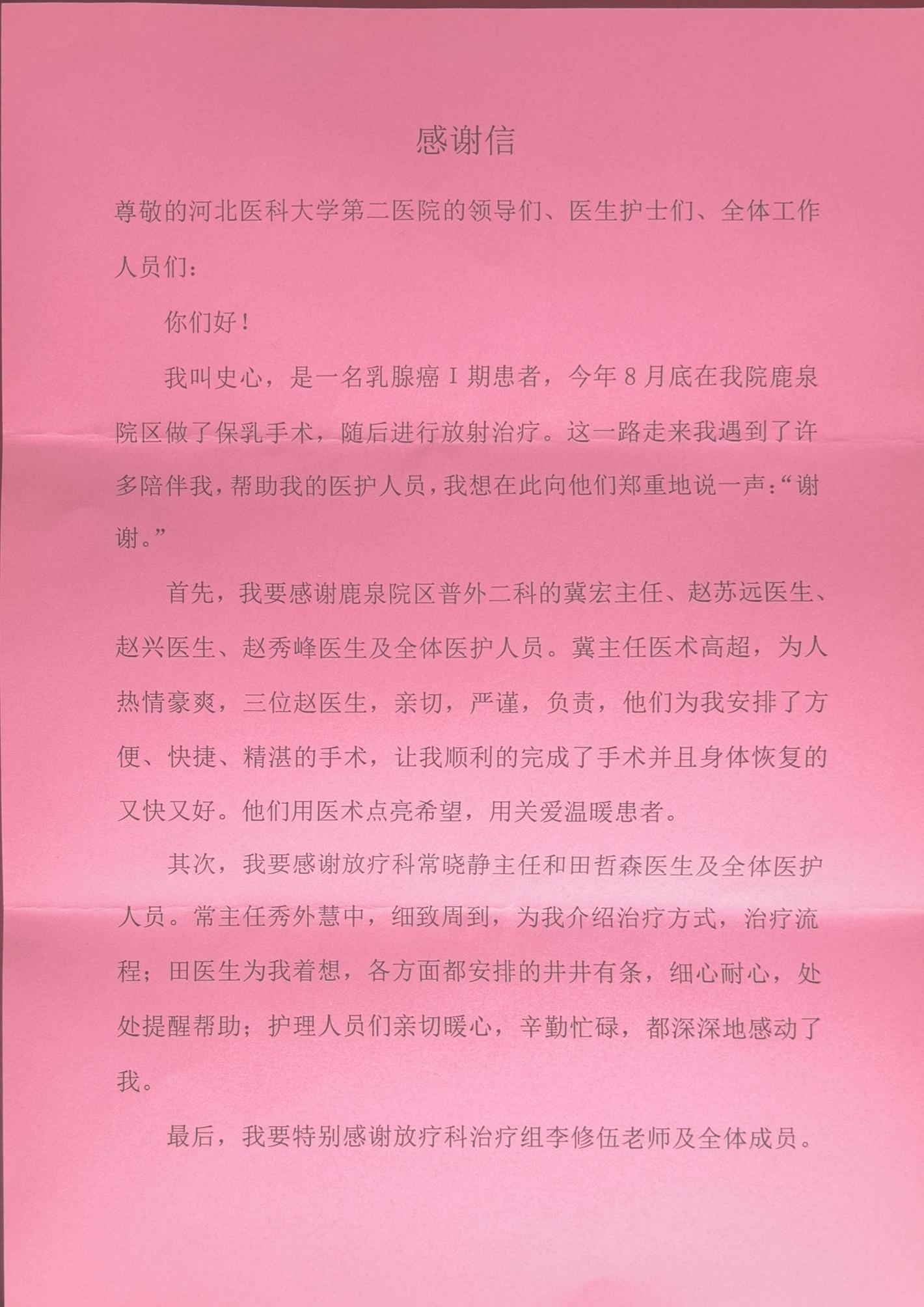 致鹿泉院区普外二科冀宏主任、赵苏远医生、赵兴医生、赵秀峰医生及全体医护人员和放疗科常晓静主任、田哲森医生、李修伍医生及全体医护人员的感谢信