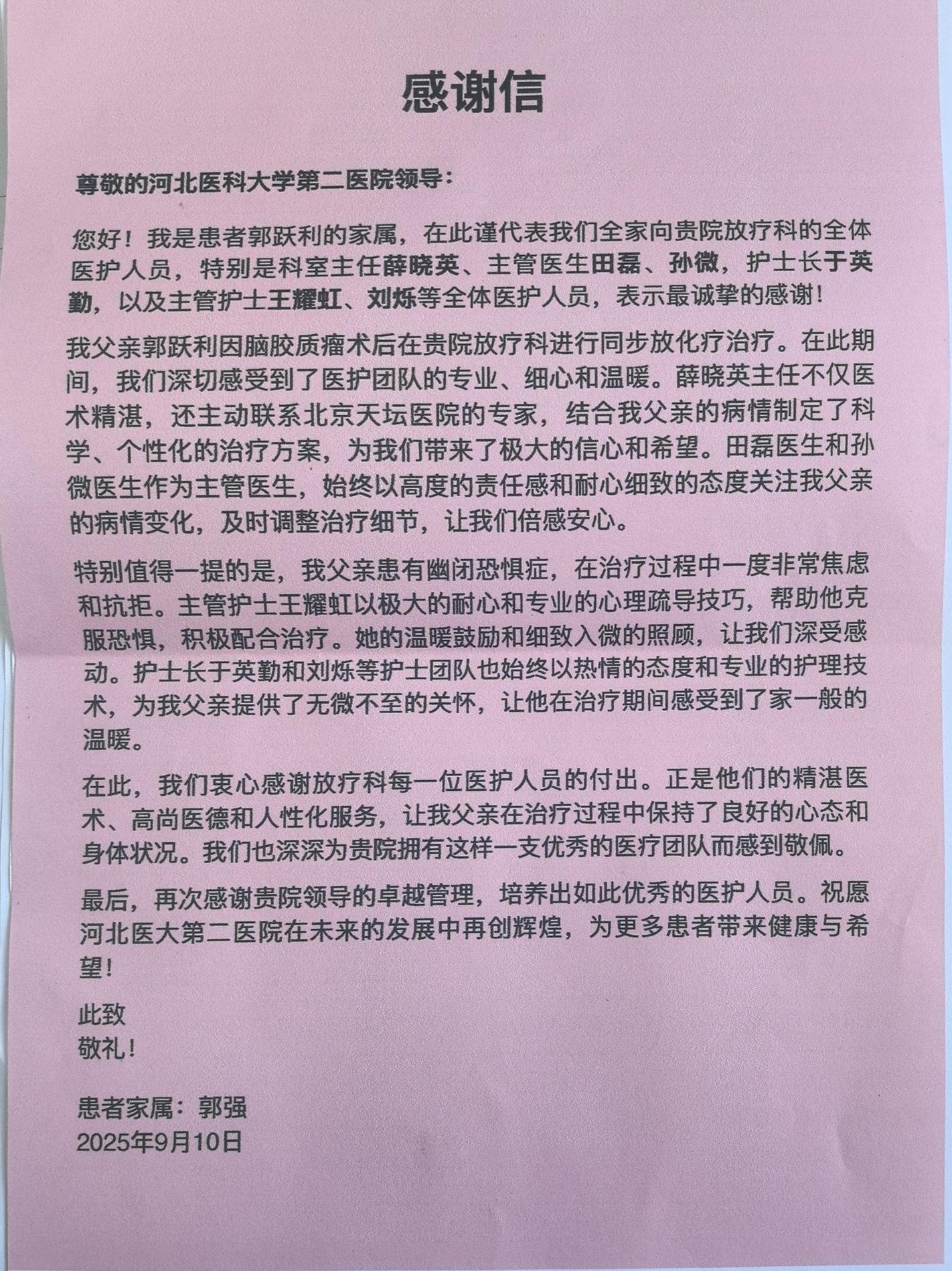 致放疗科薛晓英主任、田磊医生、孙微医生、于英勤护士长、王耀虹护士、刘烁护士及全体医护人员的感谢信
