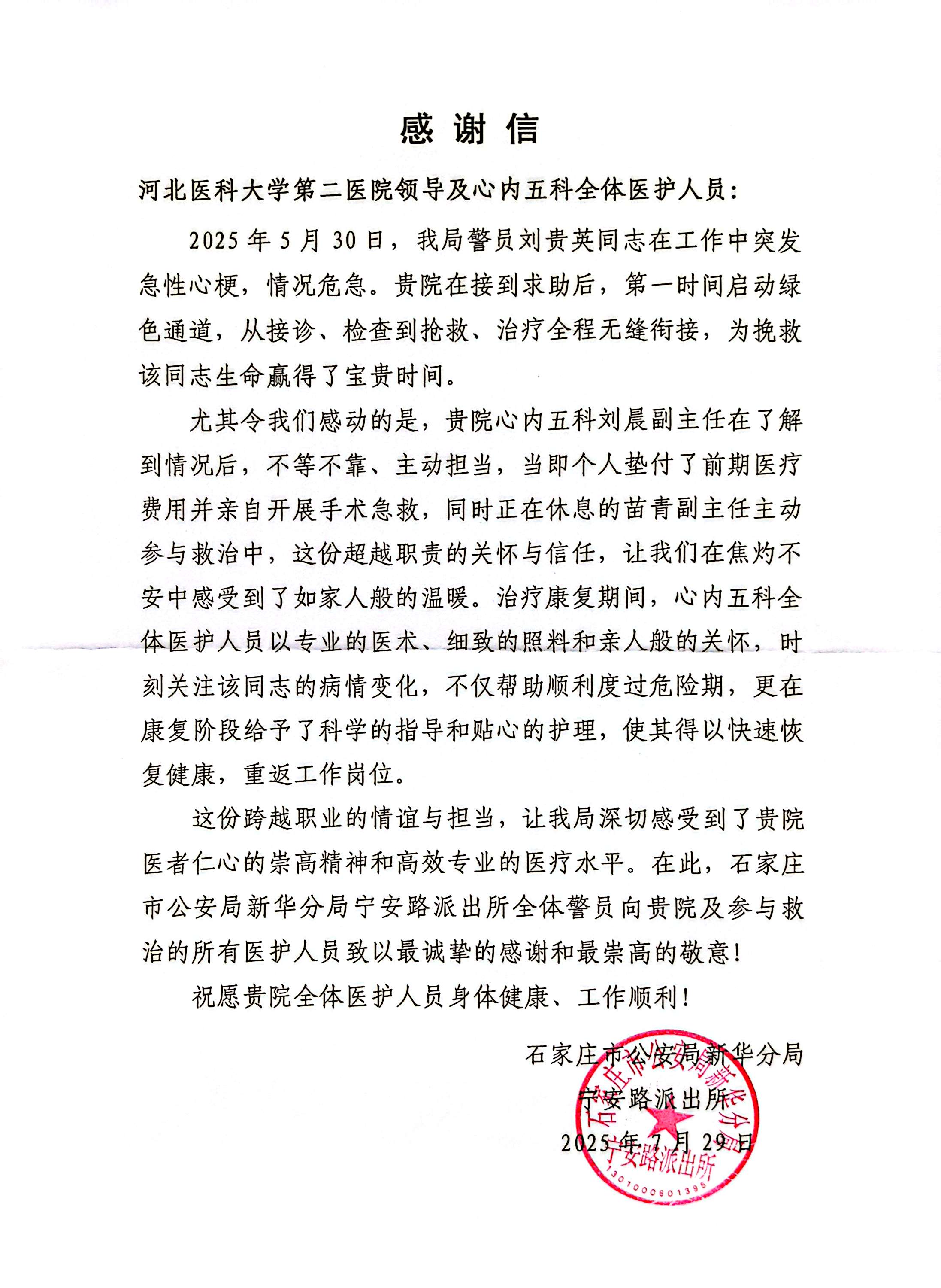 致心内五科刘晨主任、苗青主任及全体医护人员的感谢信