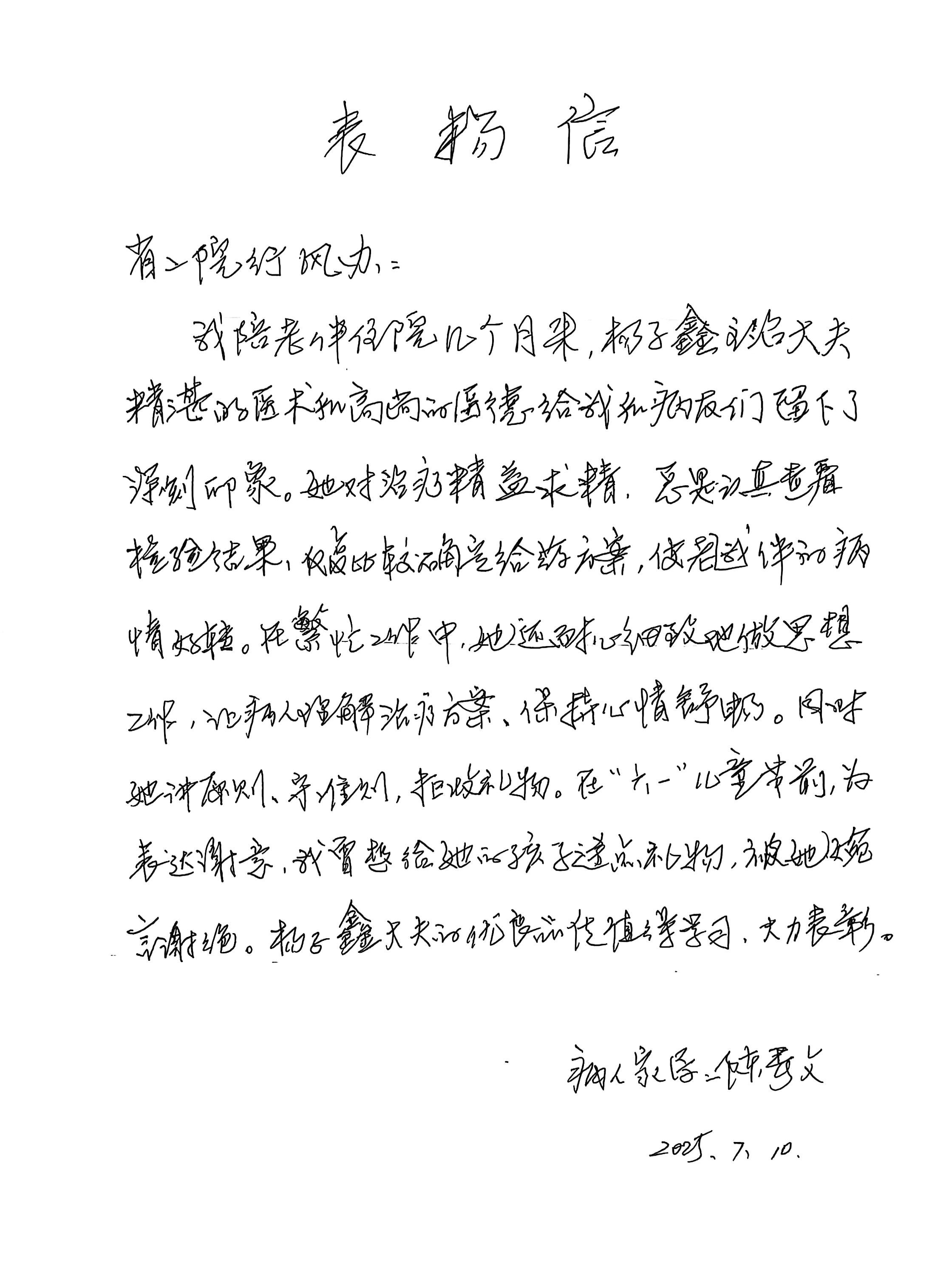 致肿瘤二科杨子鑫医生的感谢信