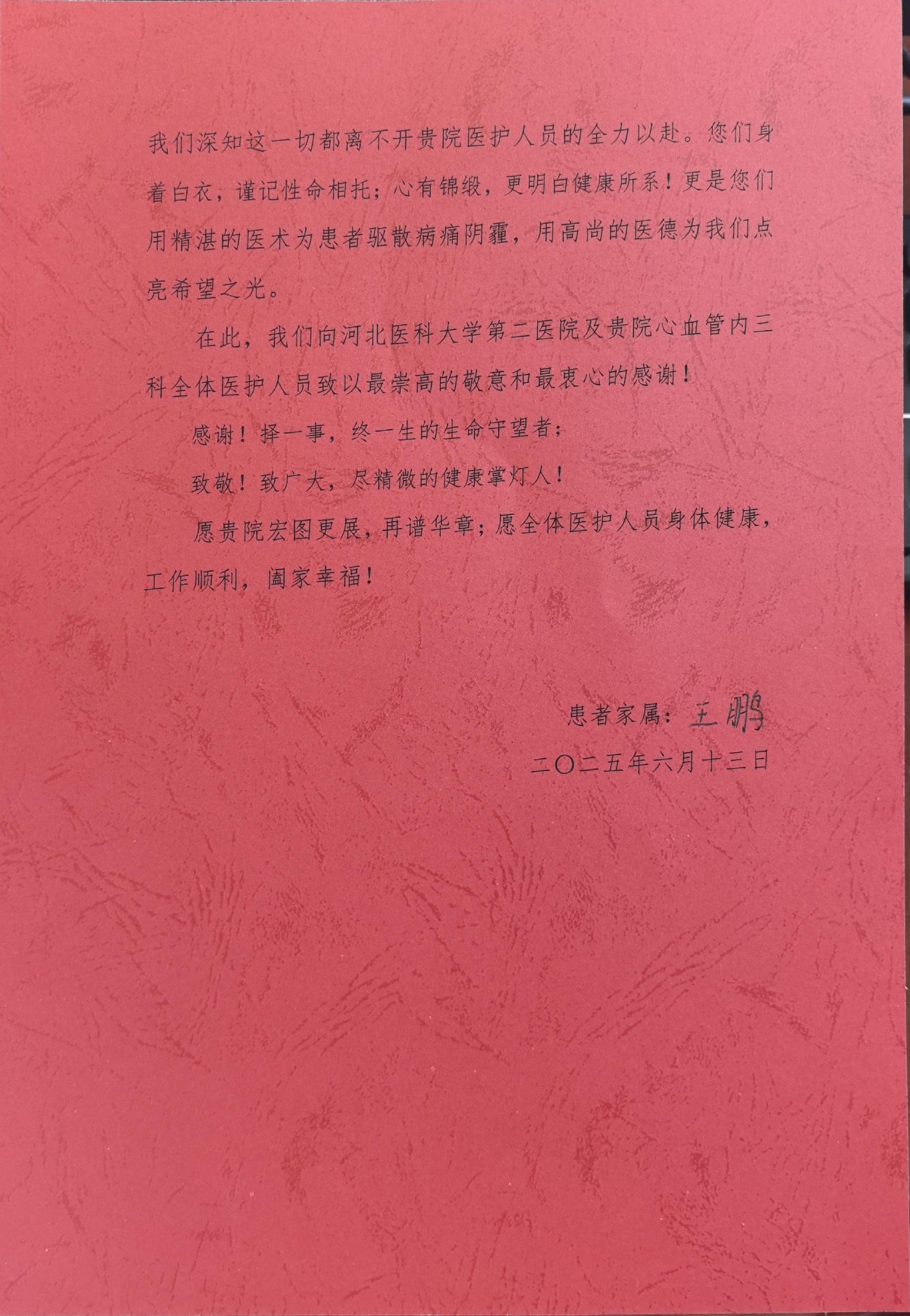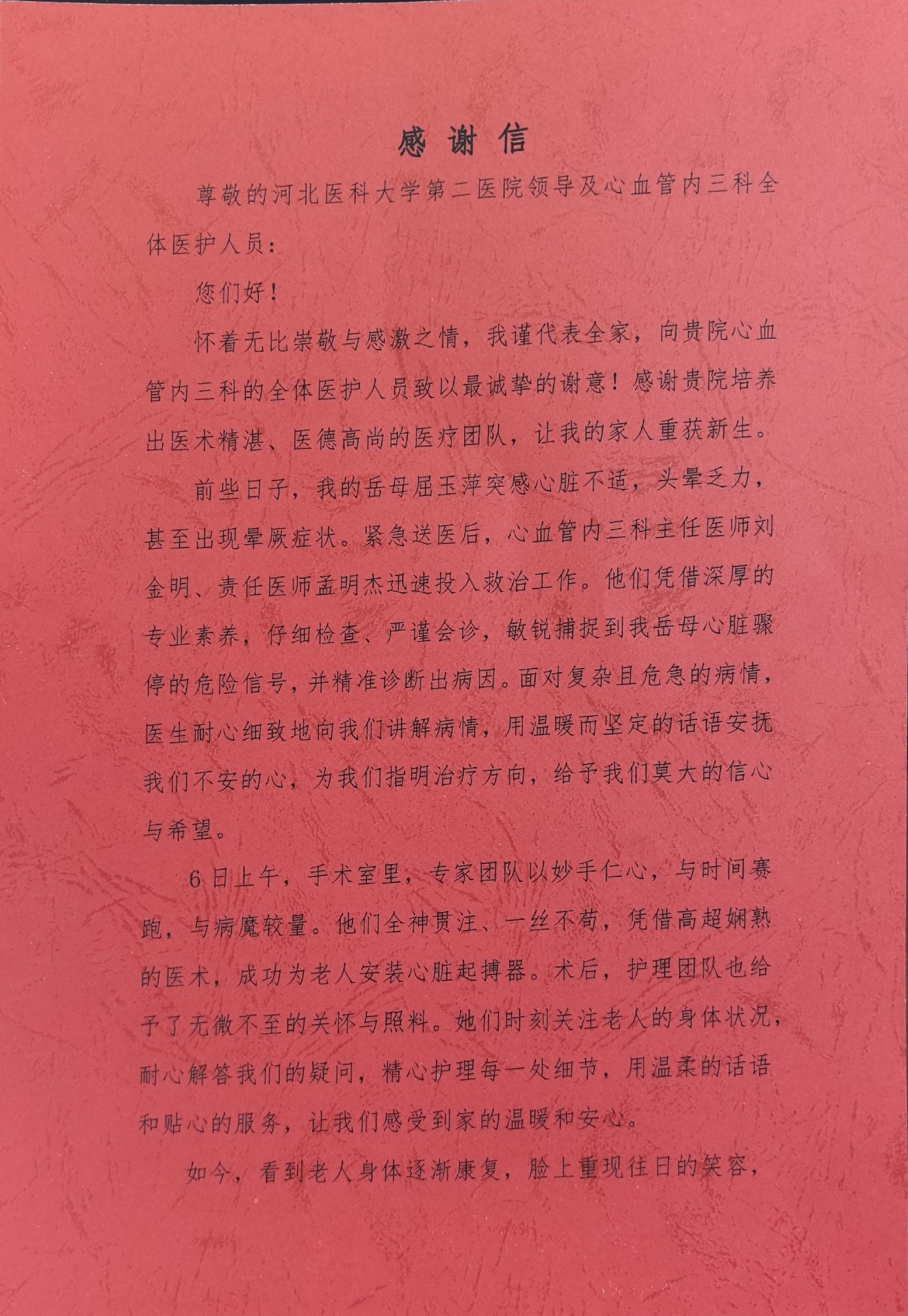 致心血管内三科刘金明主任、孟明杰医生的感谢信