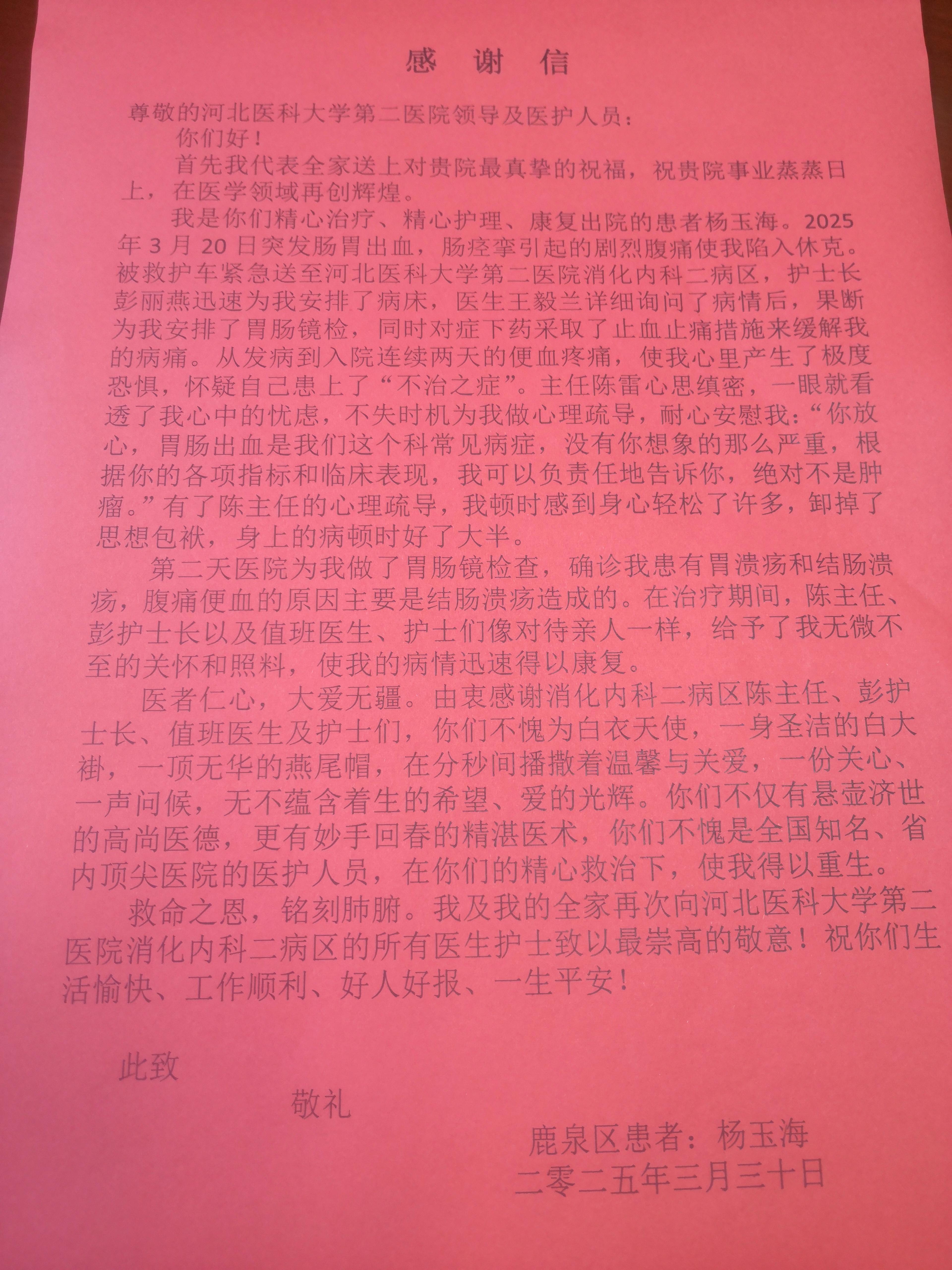 致消化内科二区陈雷、王毅兰医生及彭丽艳护士长的感谢信