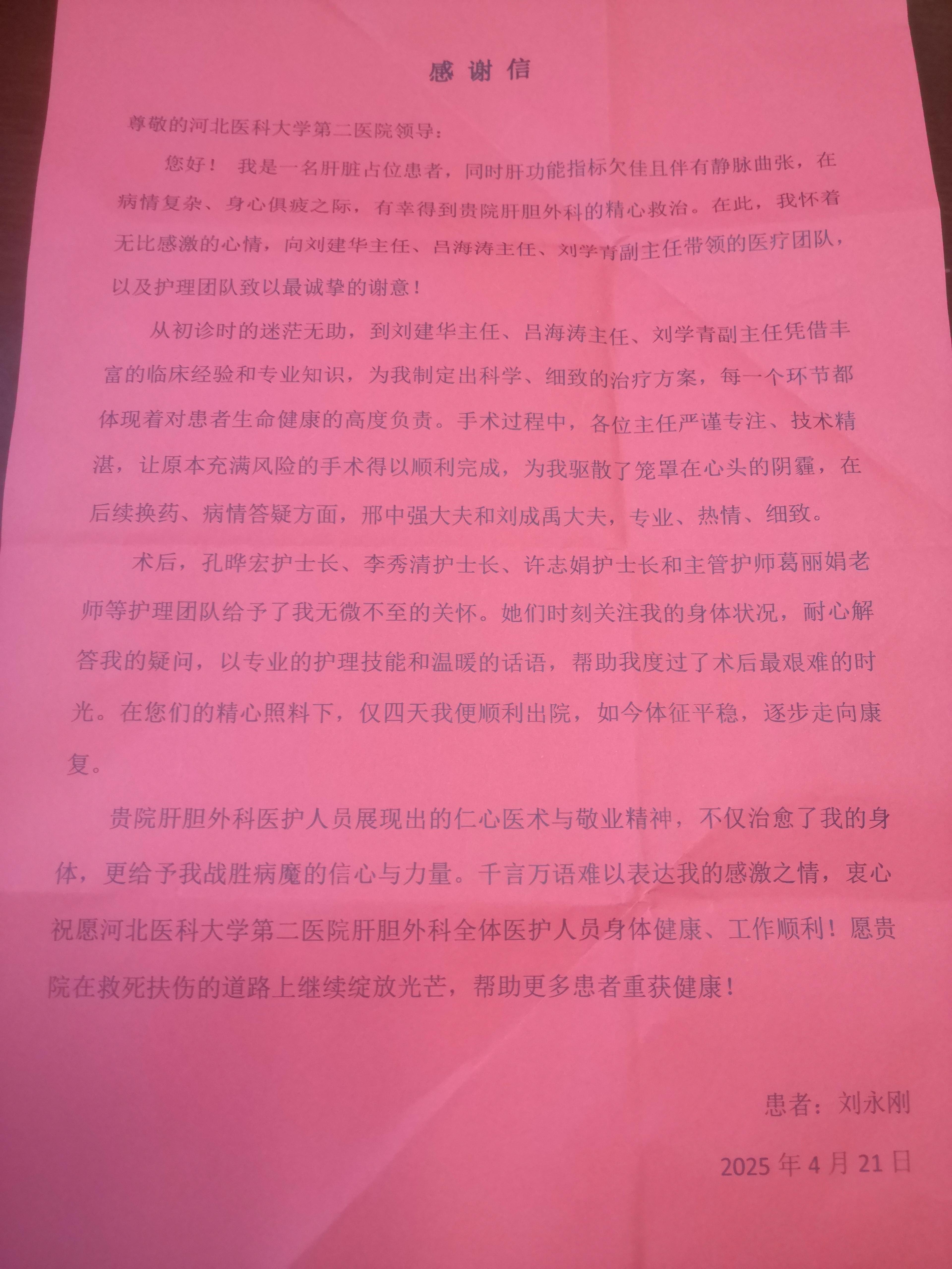 致肝胆外科吕海涛主任及其团队的感谢信