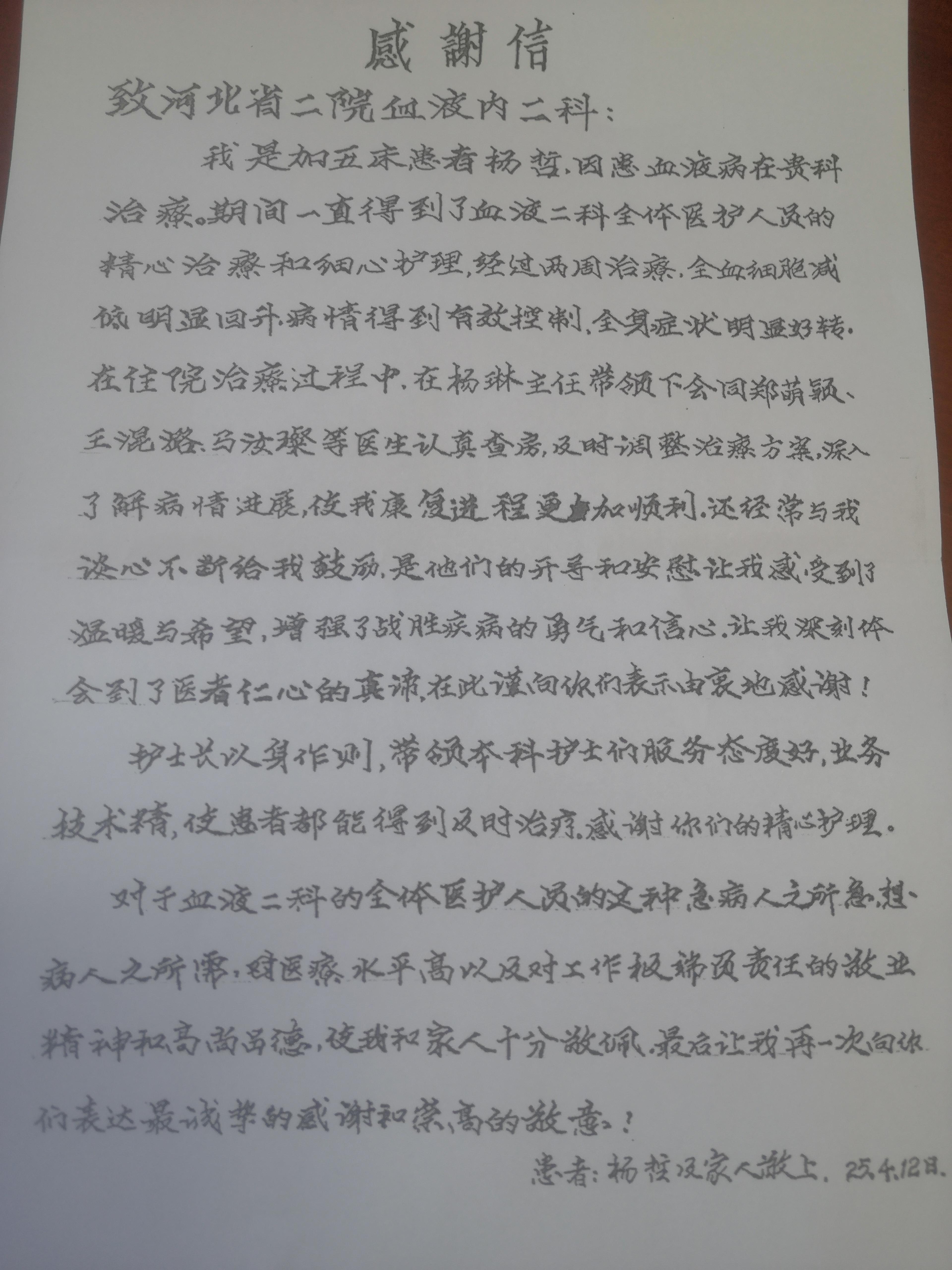 致血液内科二病区杨琳主任团队及护理团队的感谢信