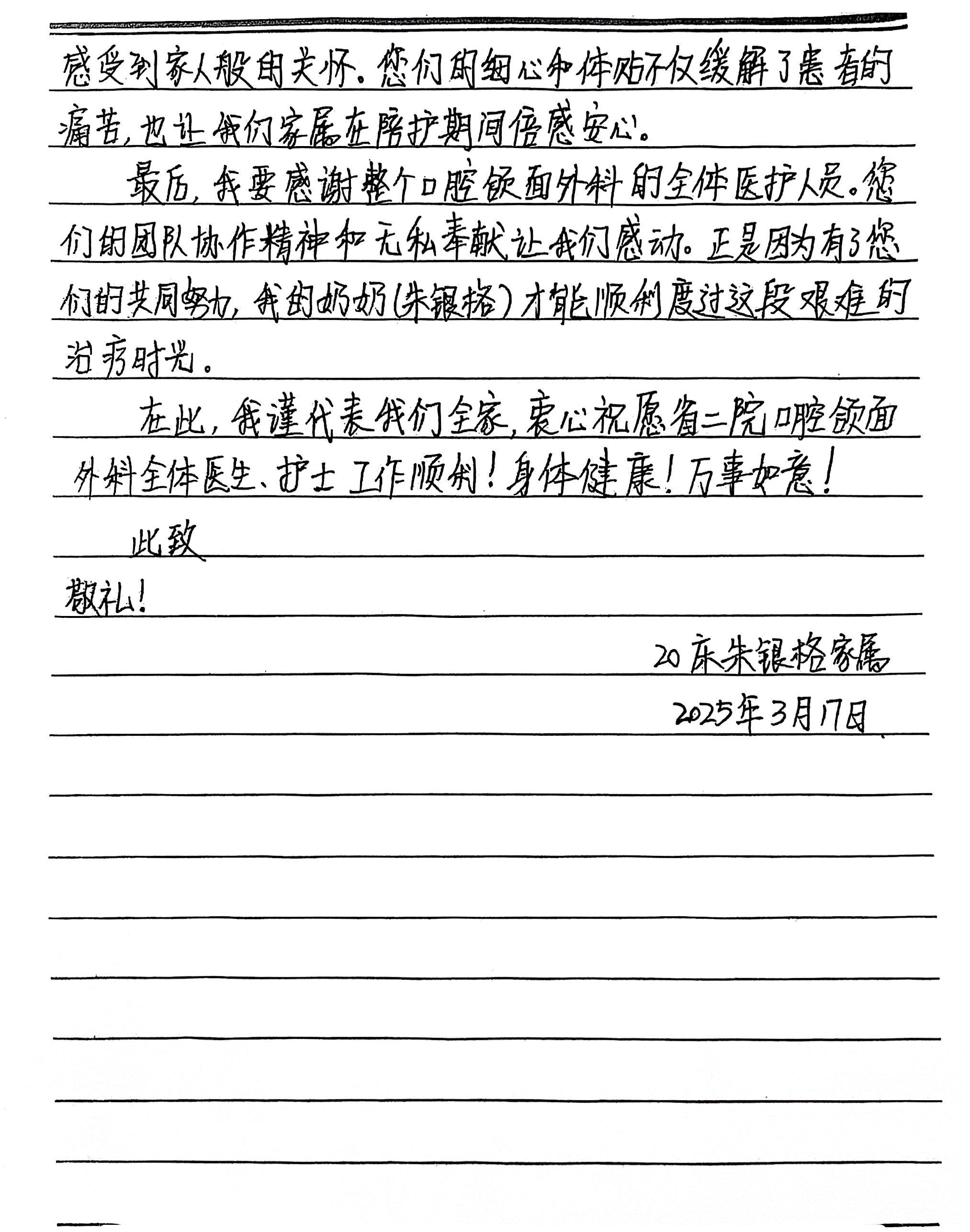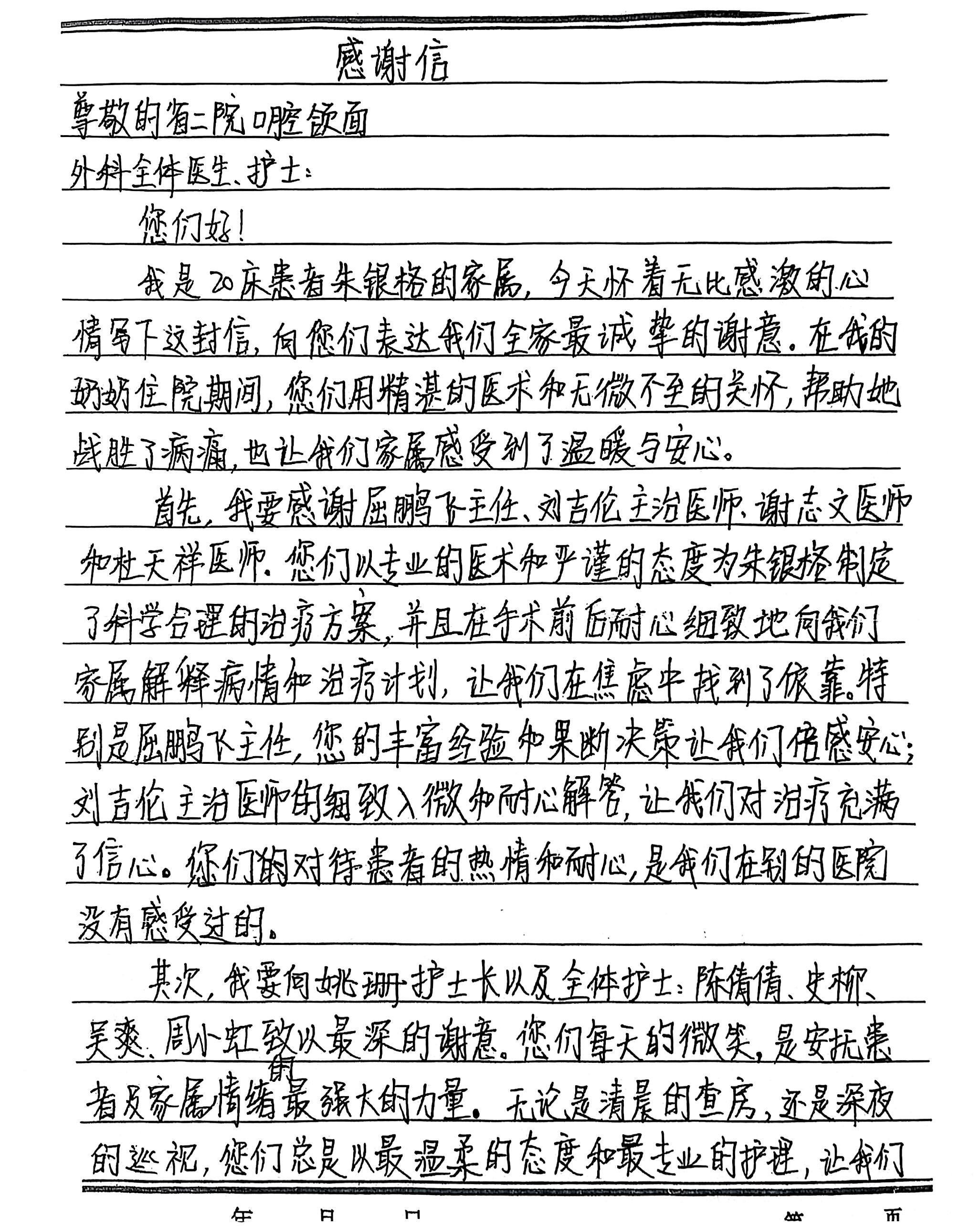 致口腔颌面外科屈鹏飞主任、姚珊护士长及全体医护人员的感谢信
