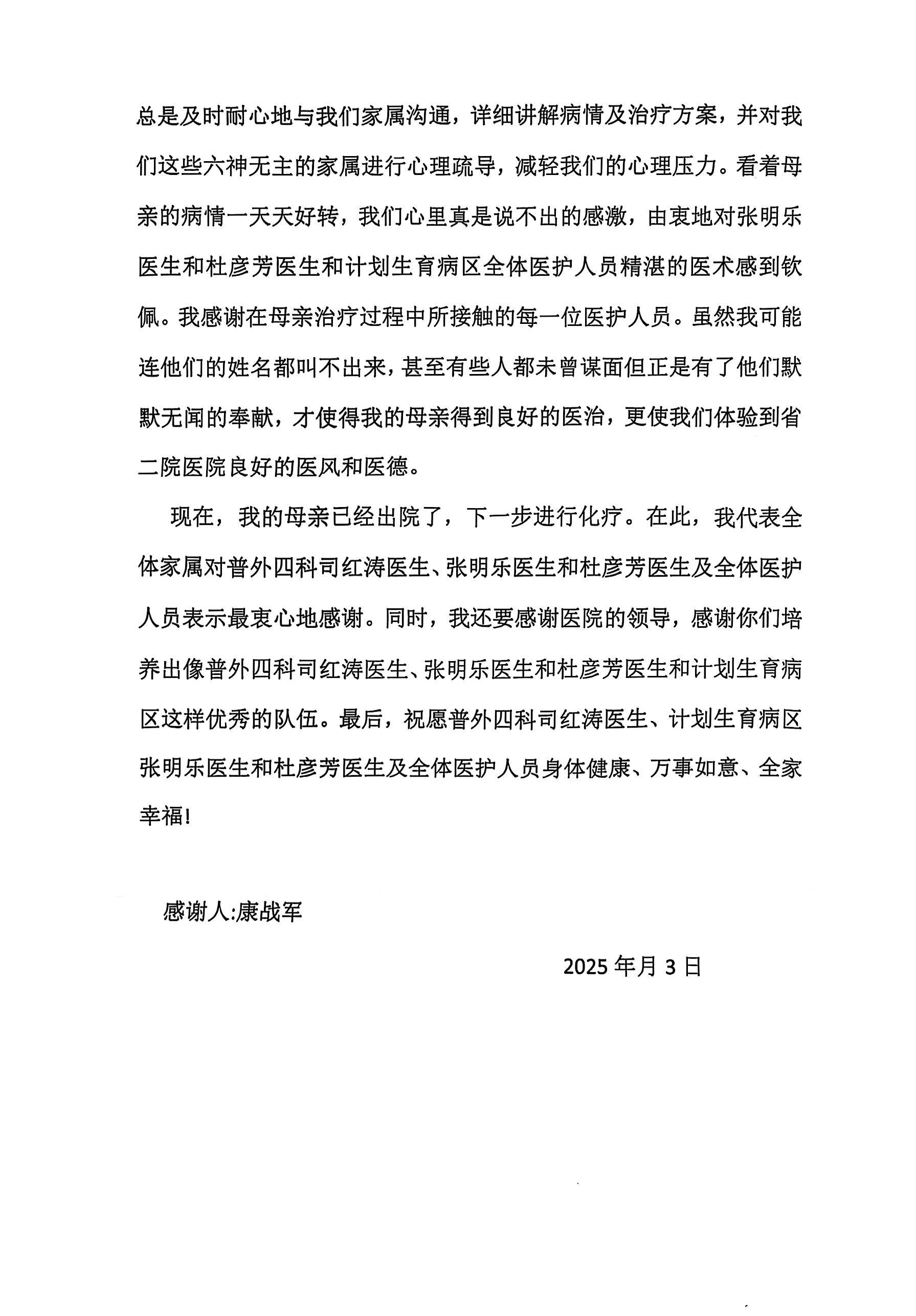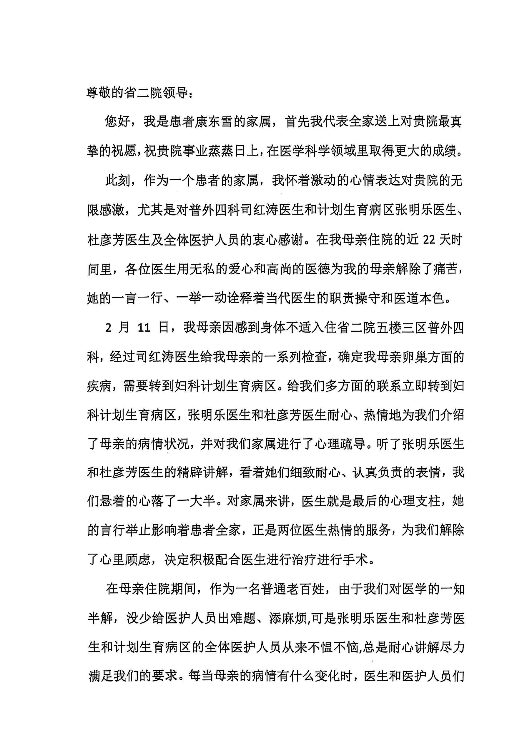 致妇科二病区杜彦芳主任、张明乐医生及普外四科司红涛医生的感谢信