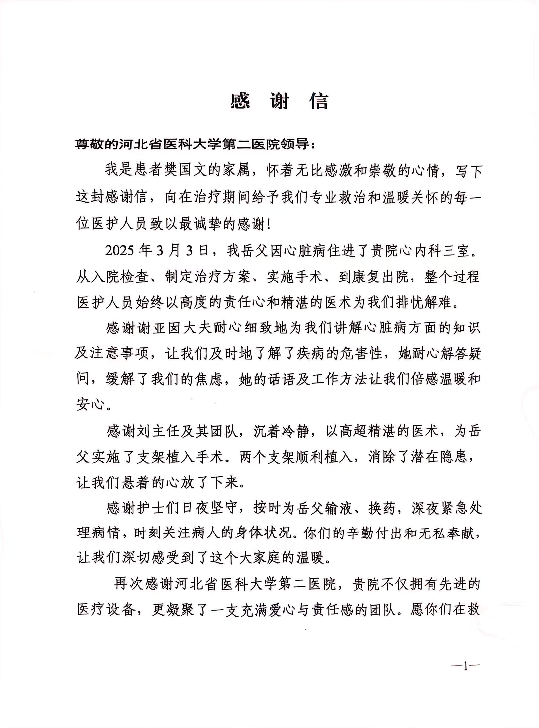 致心内三科刘金明主任、谢亚囡医生的感谢信
