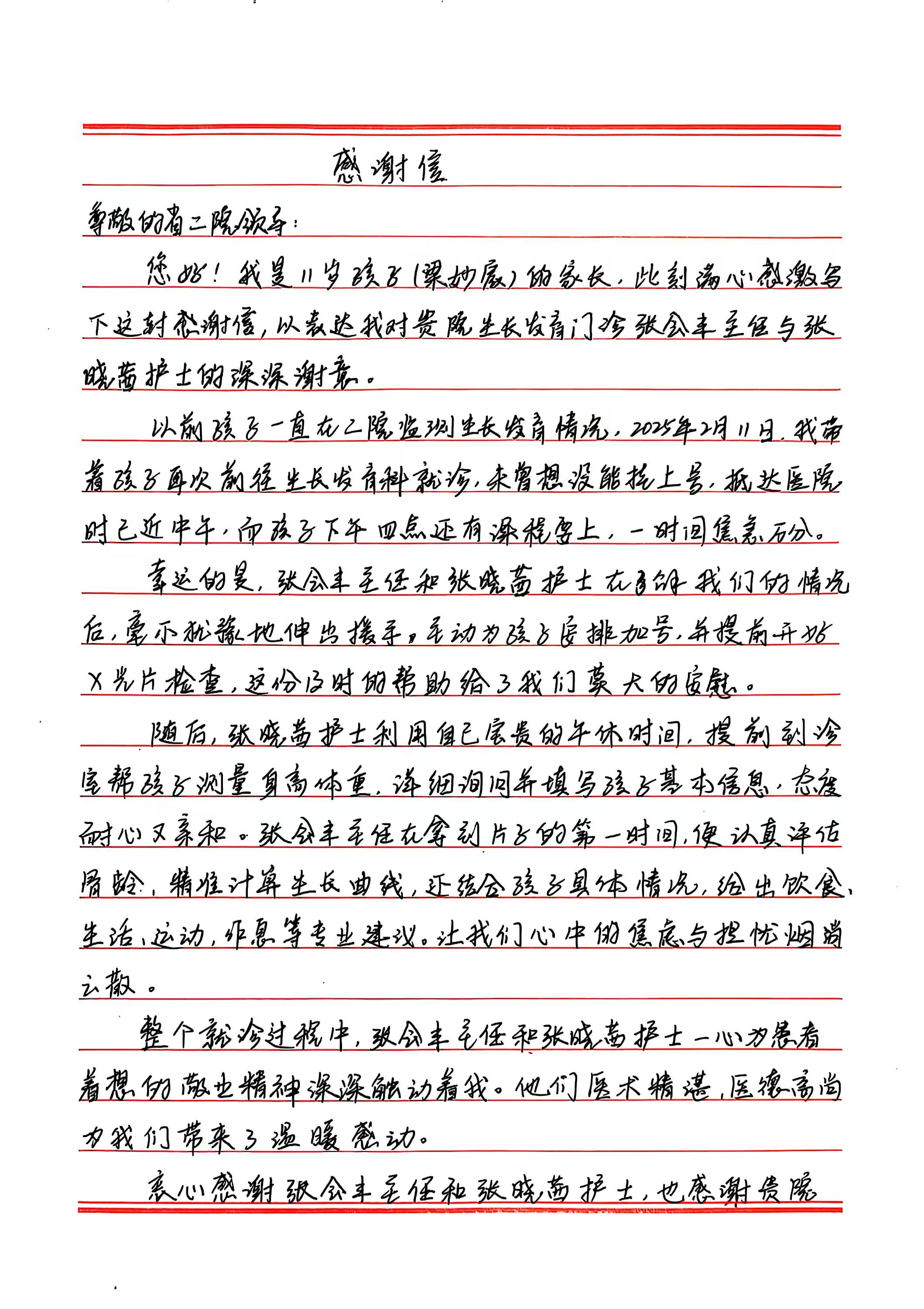 致儿科张会丰主任、张晓茜护士的感谢信