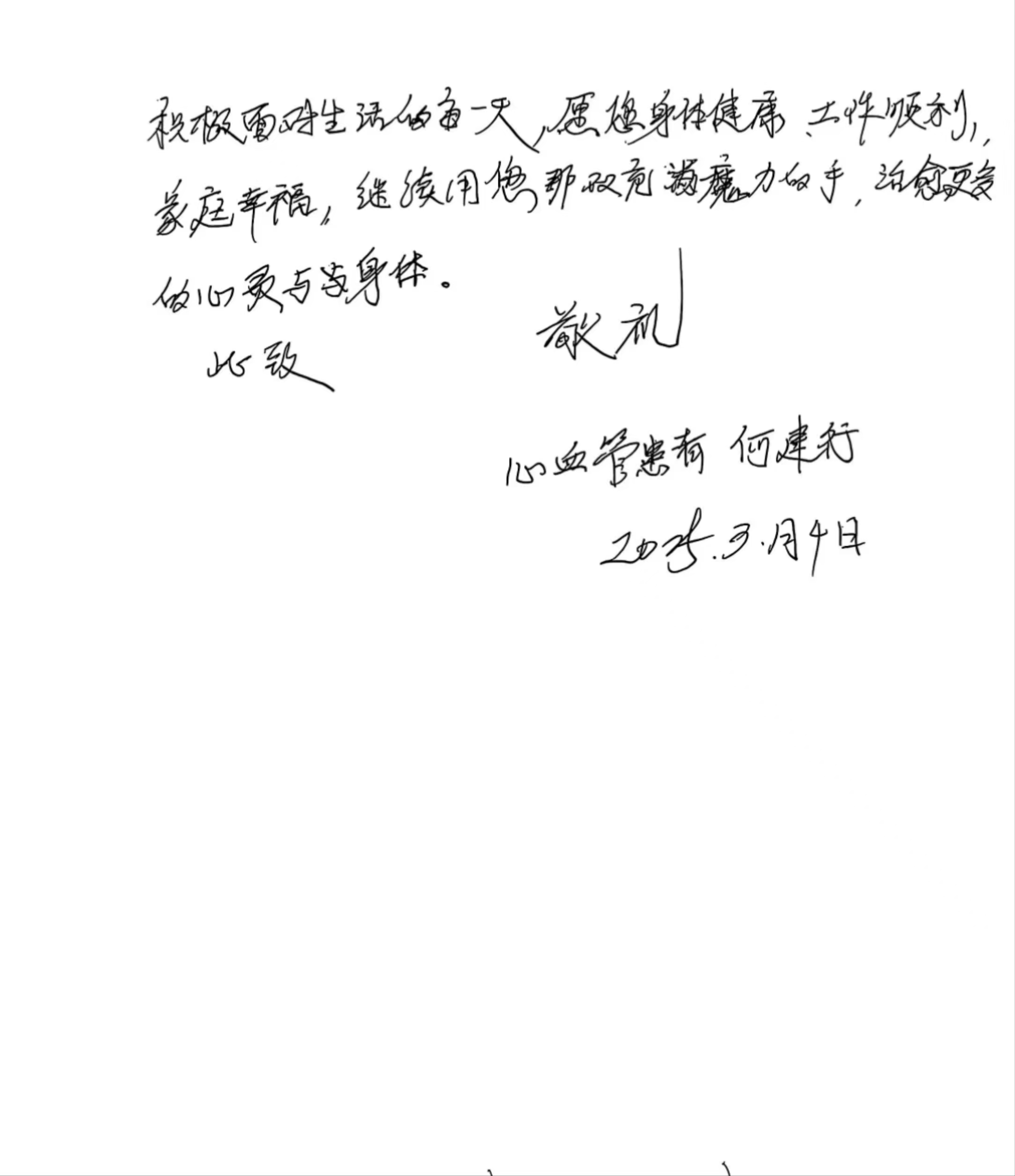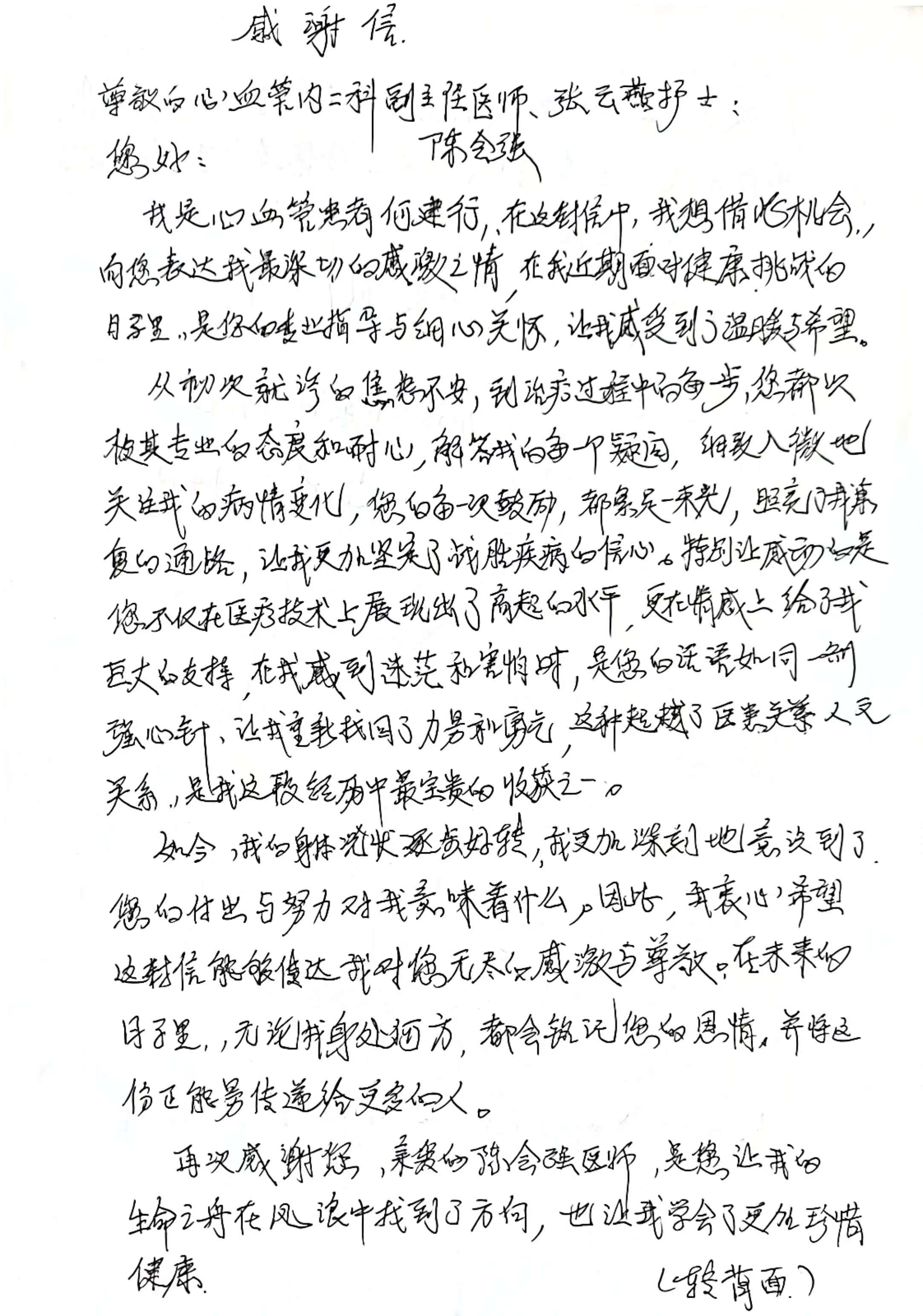 致心血管二科陈会强主任、张云燕护士的感谢信