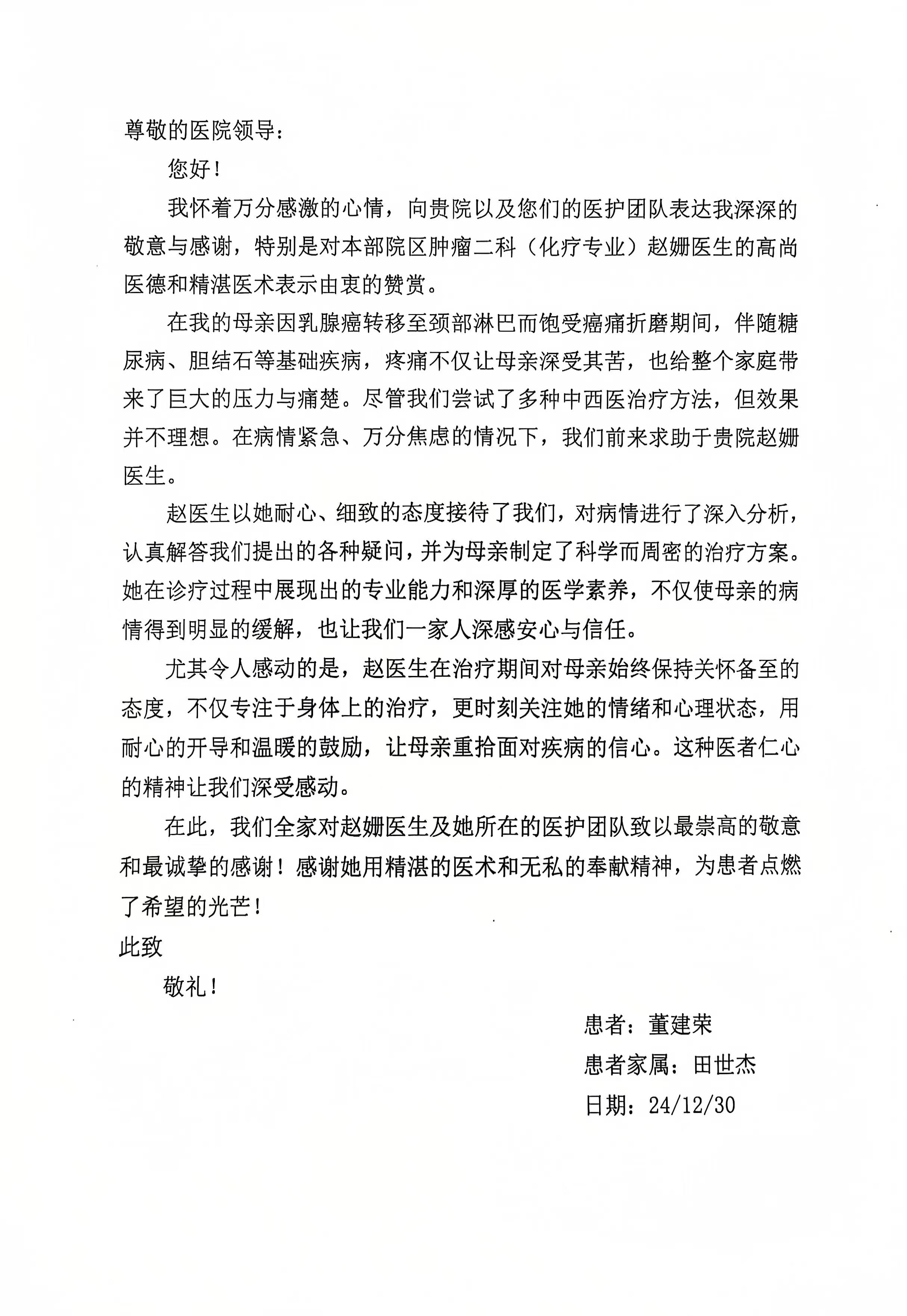 致肿瘤二科赵珊医生的感谢信