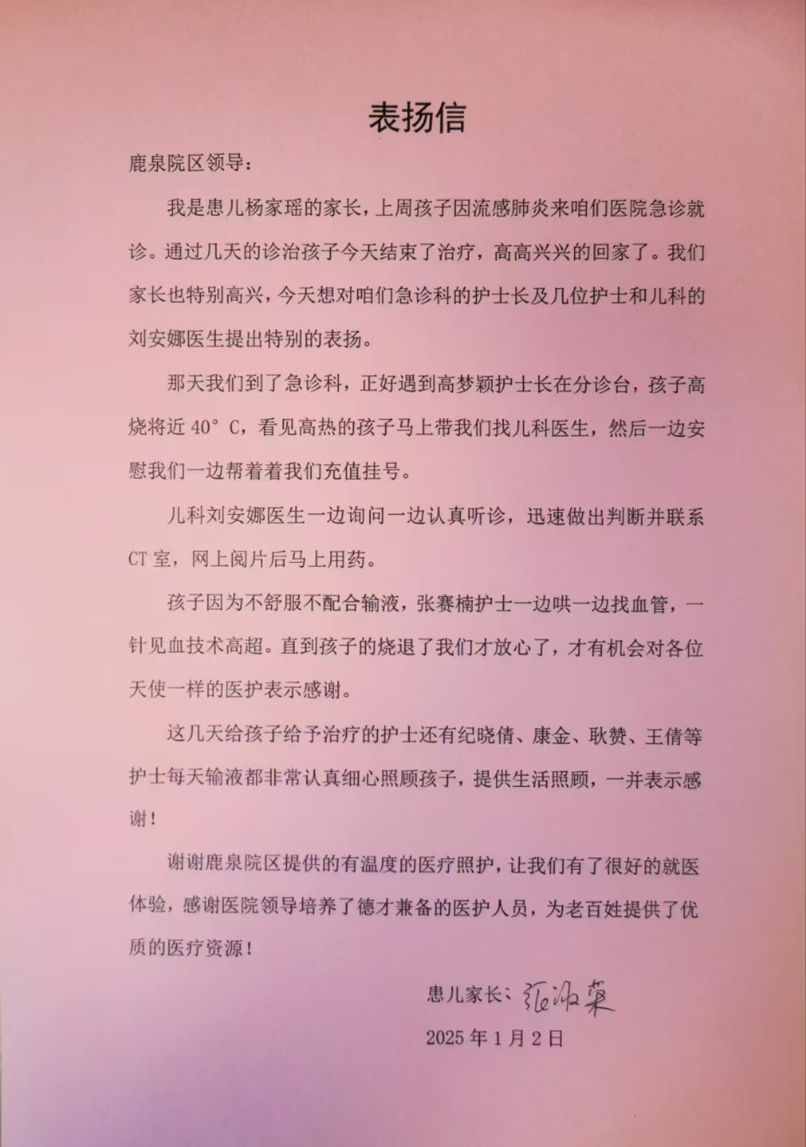 致鹿泉院区急诊重症医学科高梦颖护士长及团队的感谢信
