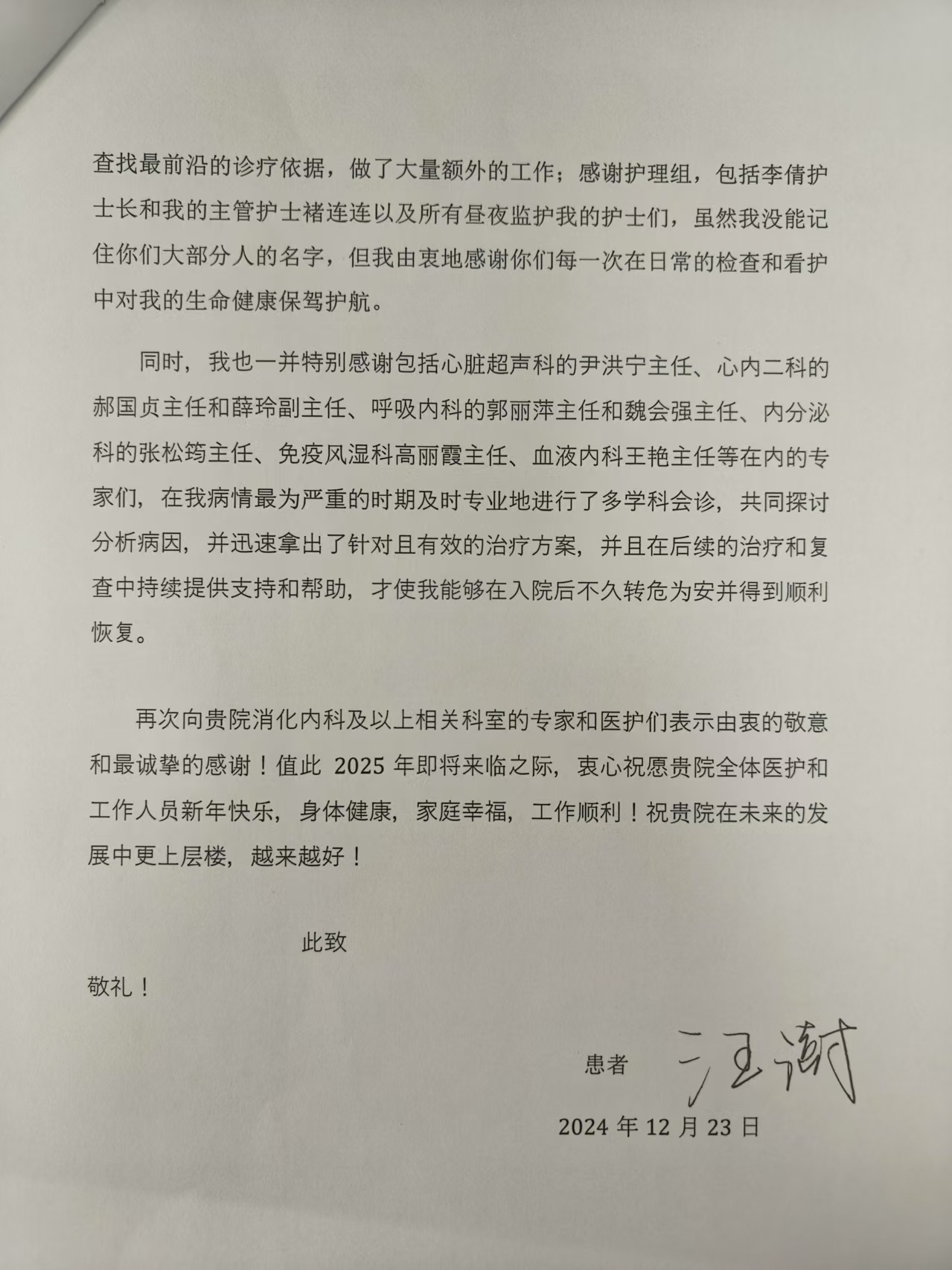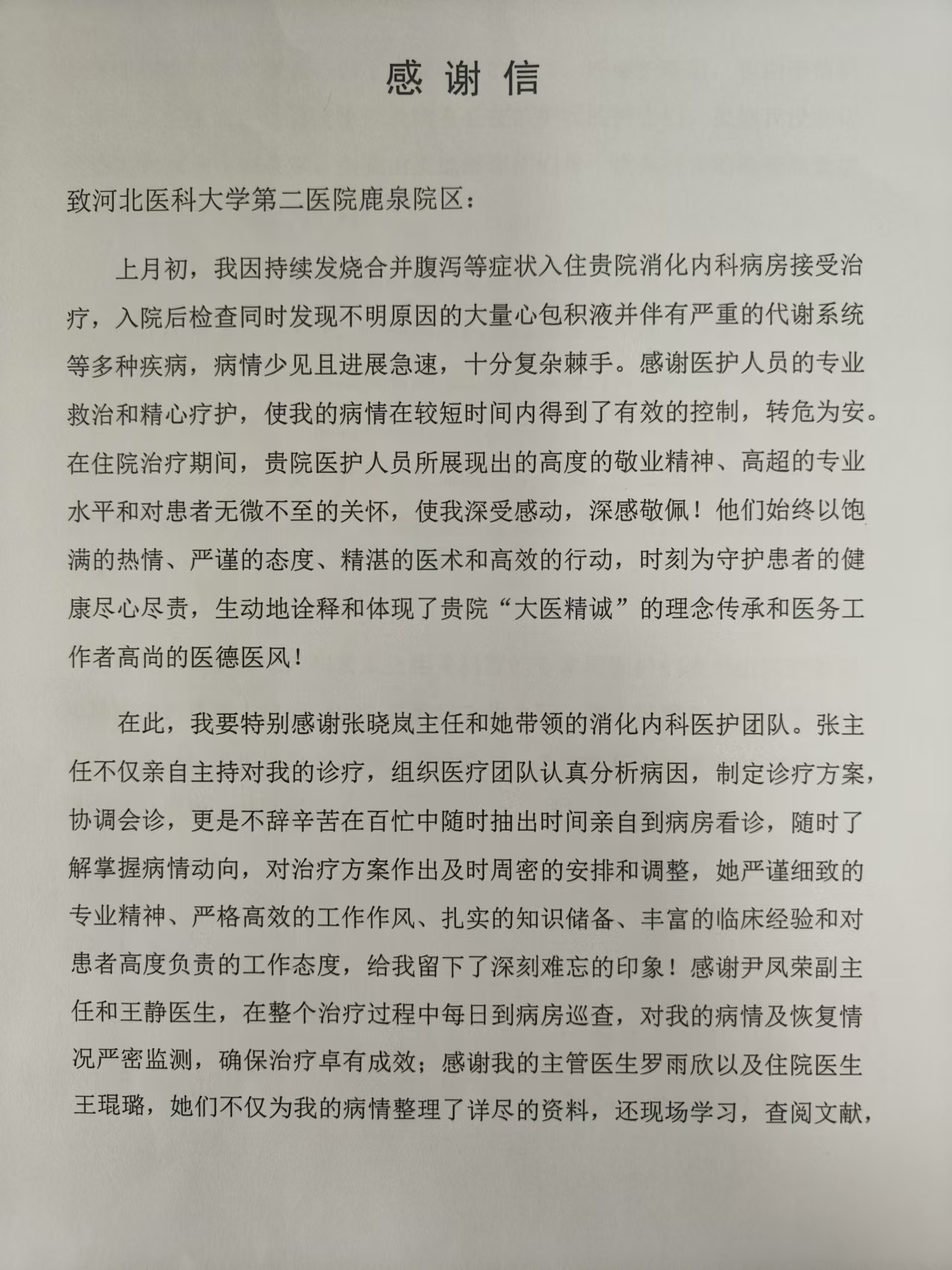 致鹿泉院区消化内科张晓岚主任及相关科室专家及团队的感谢信
