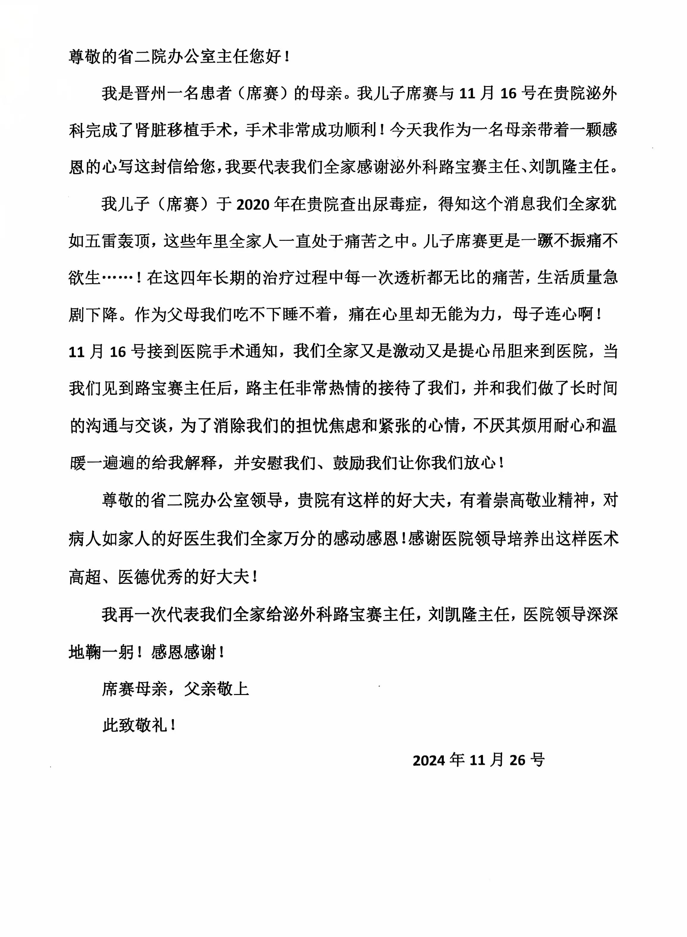 致泌尿外科路保赛、刘凯隆主任的感谢信