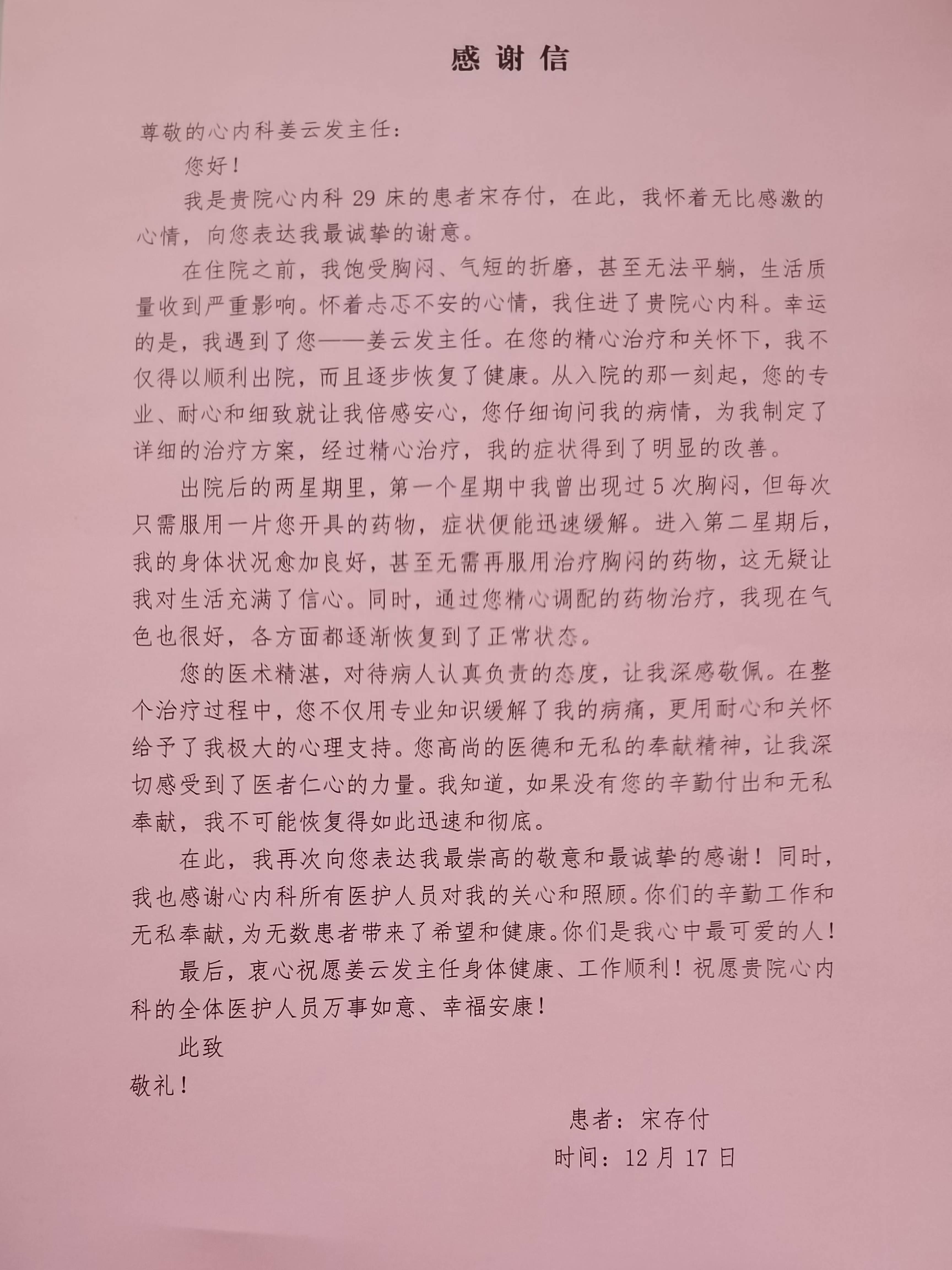致心内五科姜云发主任的感谢信