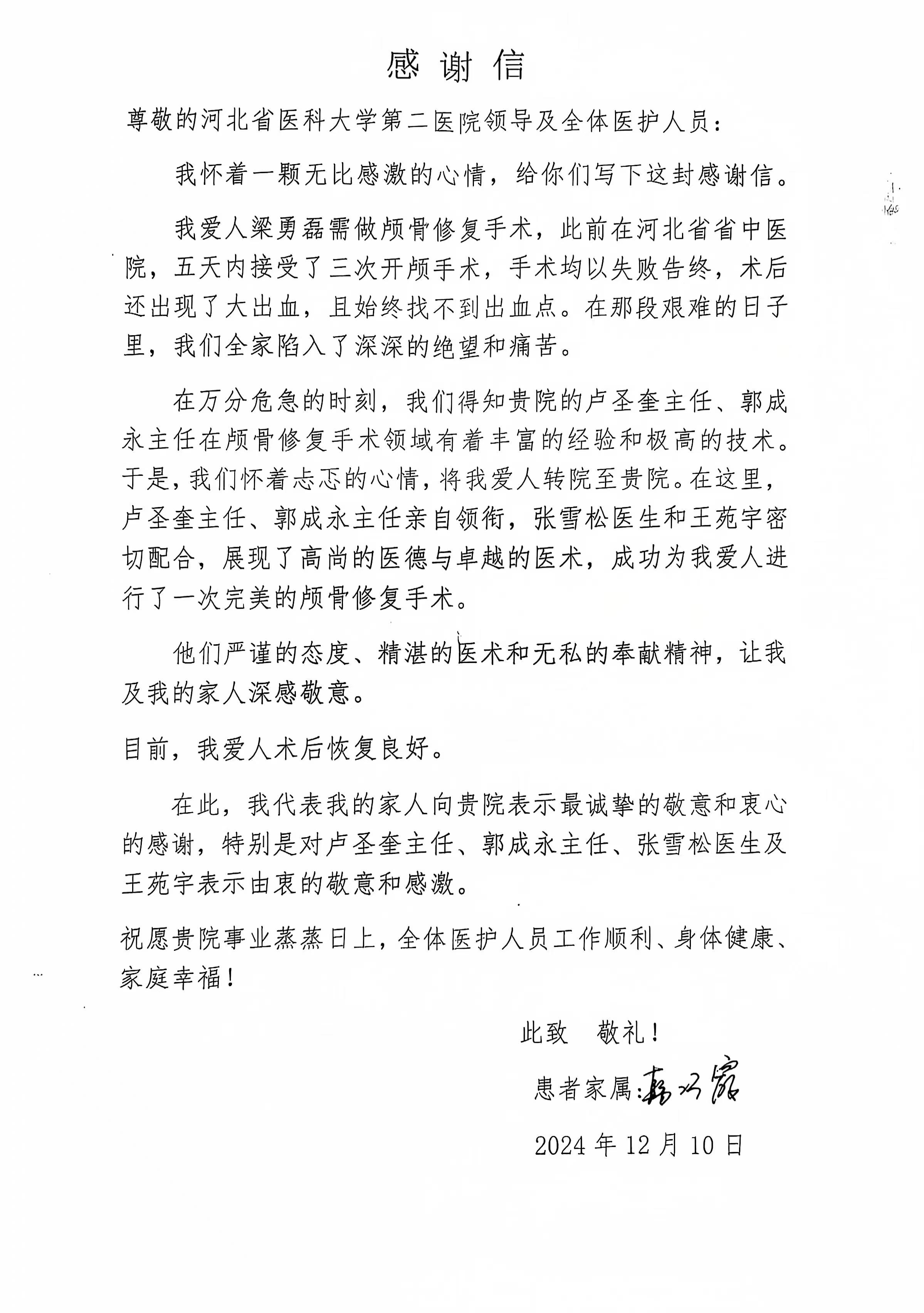 致鹿泉院区神经外科卢圣奎主任、郭成永主任及团队的感谢信