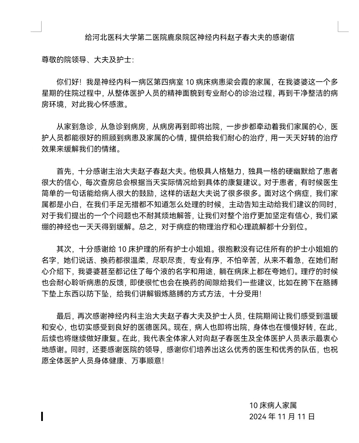 致鹿泉院区神经内一科赵子春大夫的感谢信