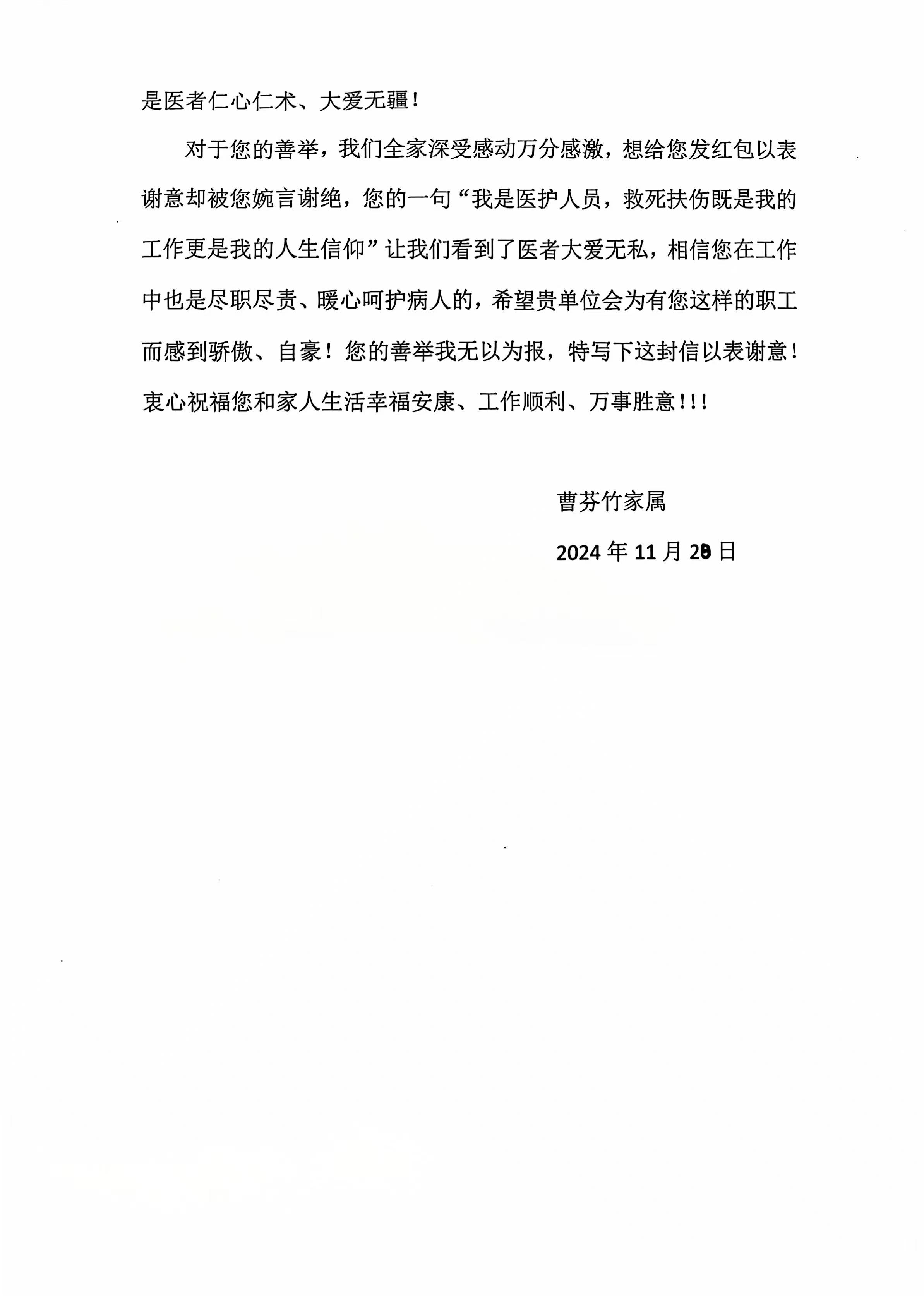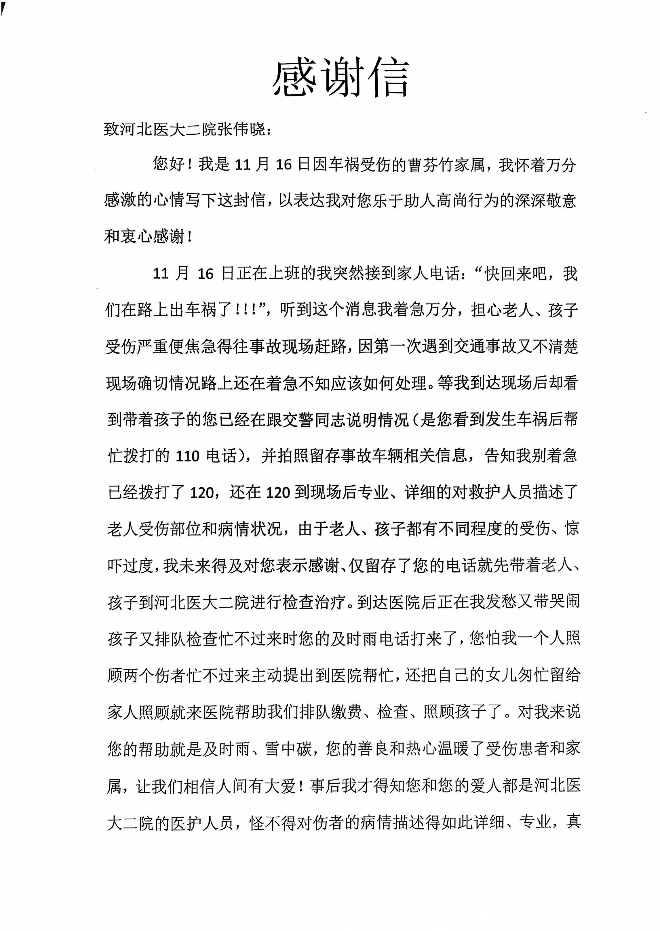 致心内三科张伟晓护士的感谢信