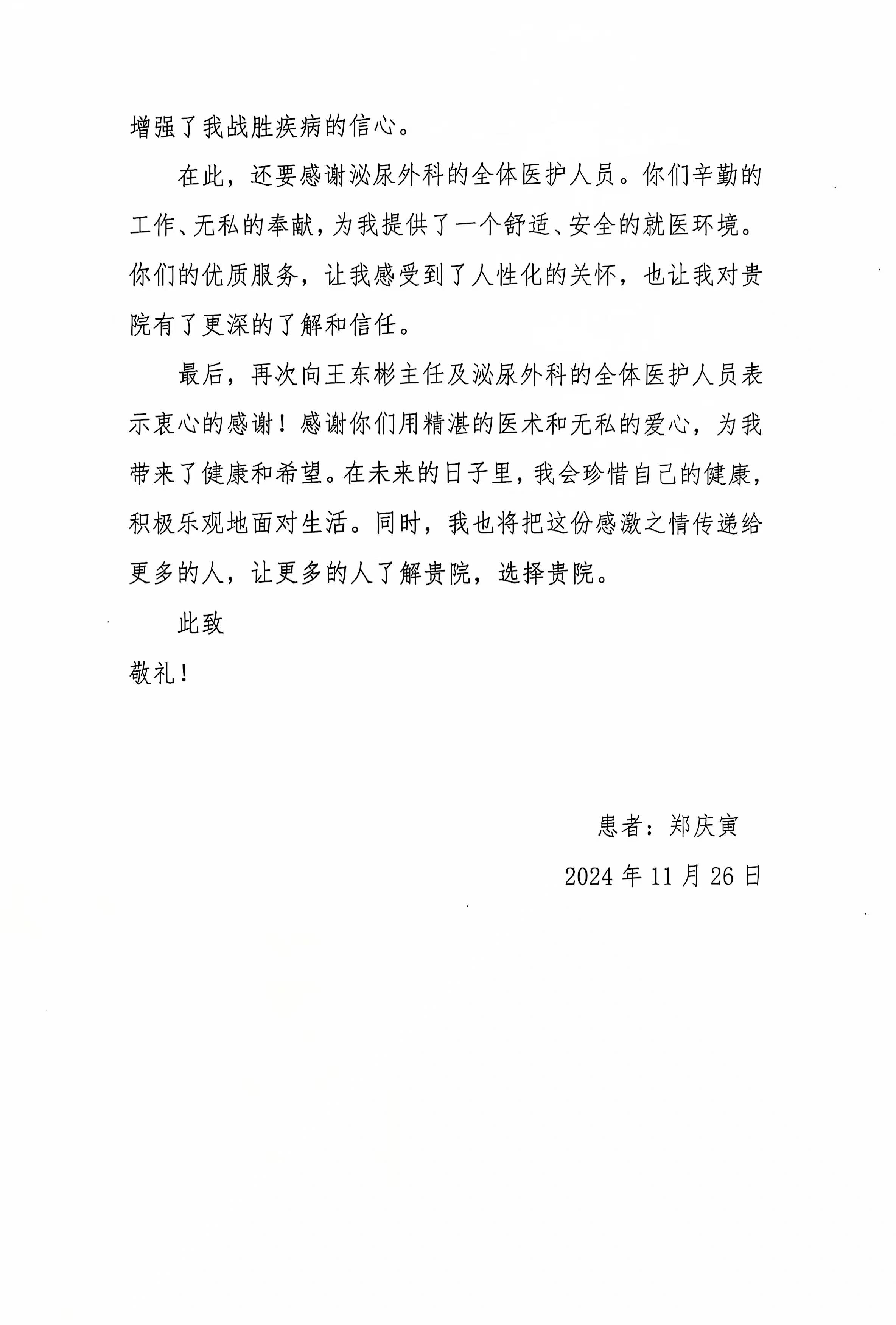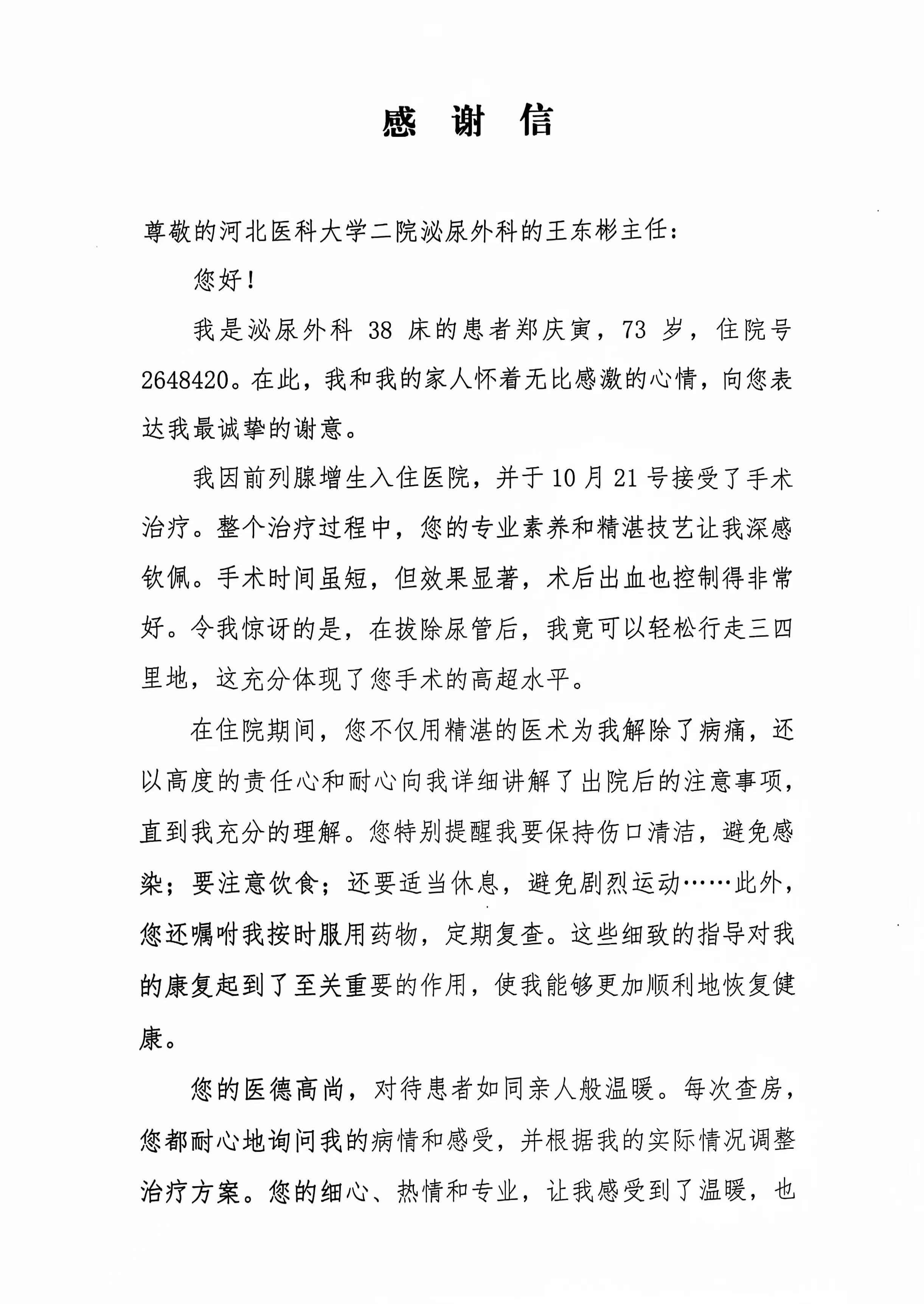 致泌尿外科王东彬主任的感谢信