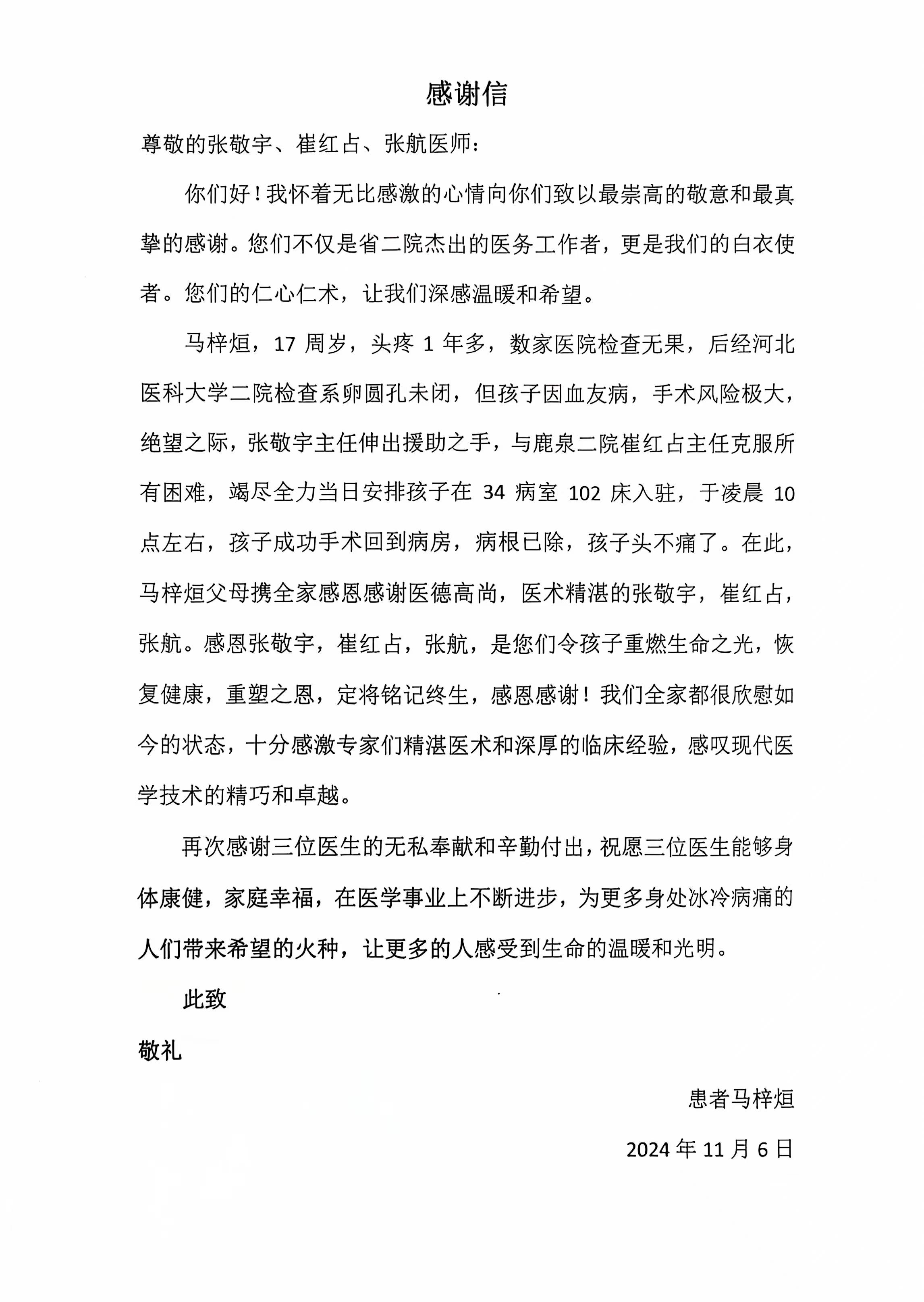 致血液内科一病区张敬宇主任、鹿泉院区心脏外科一病区崔红占医师、鹿泉院区心脏外科三病区张航医师感谢信