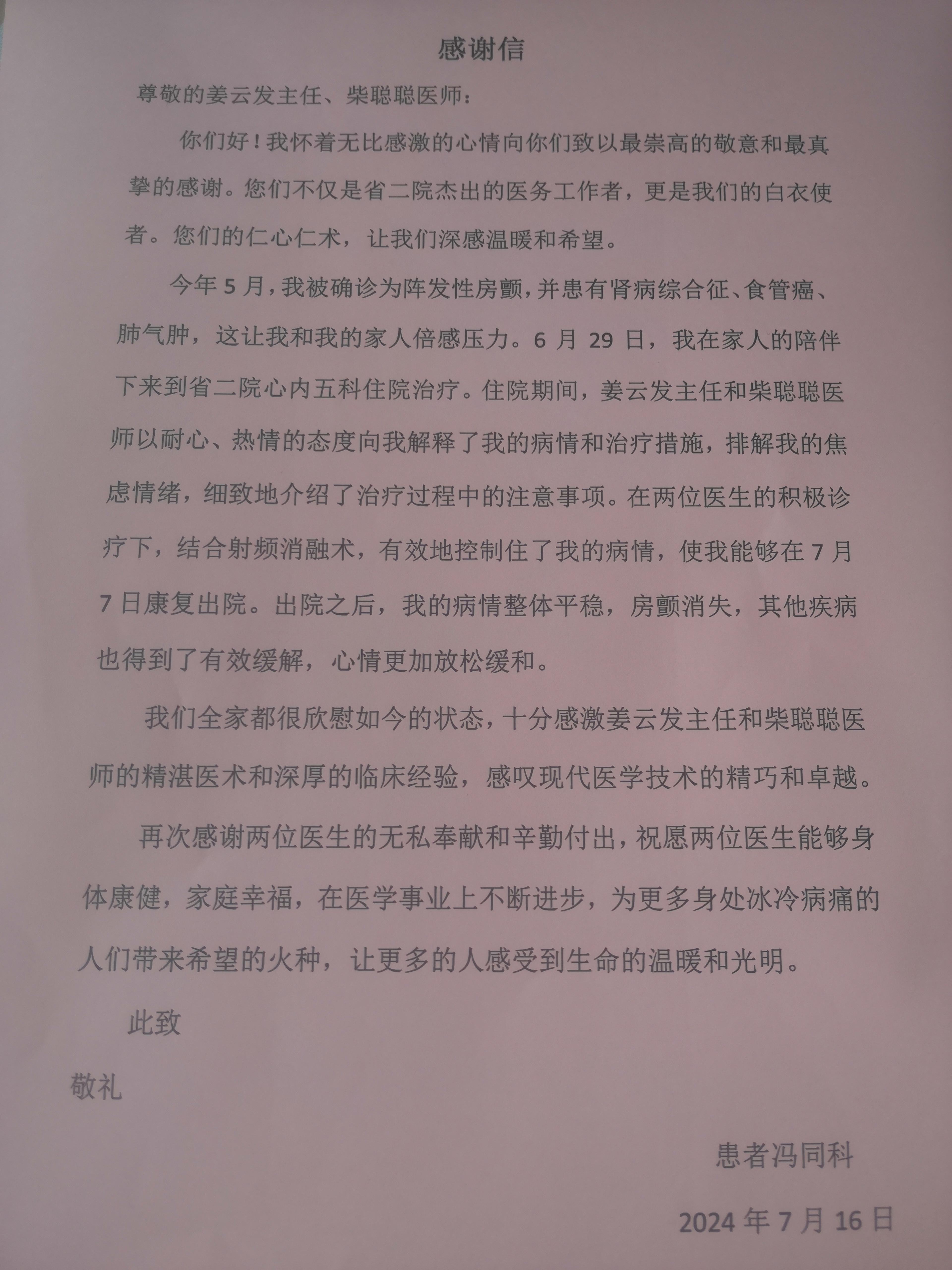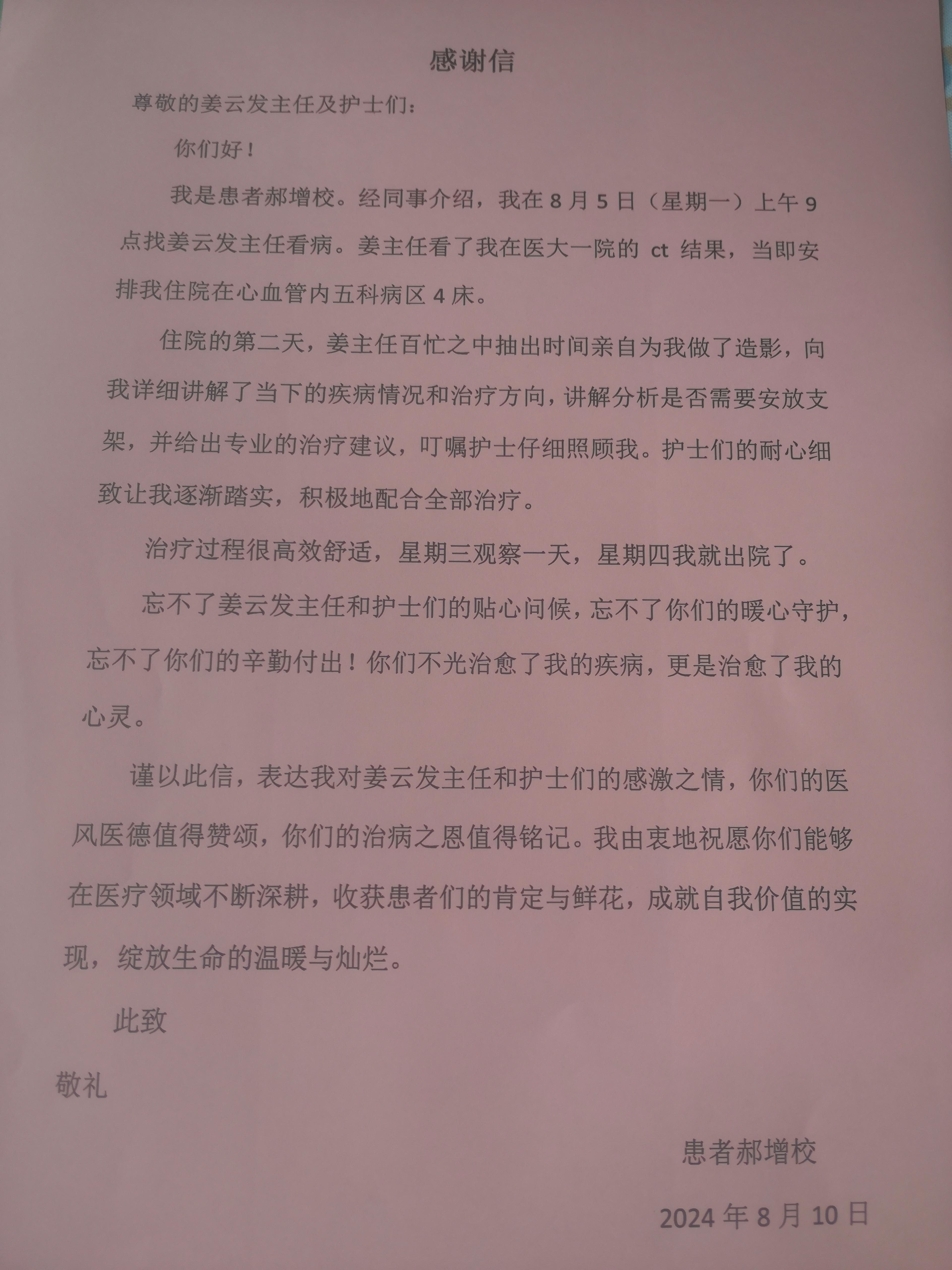 致我院放疗科、呼吸内一科、胸外科医疗团队感谢信
