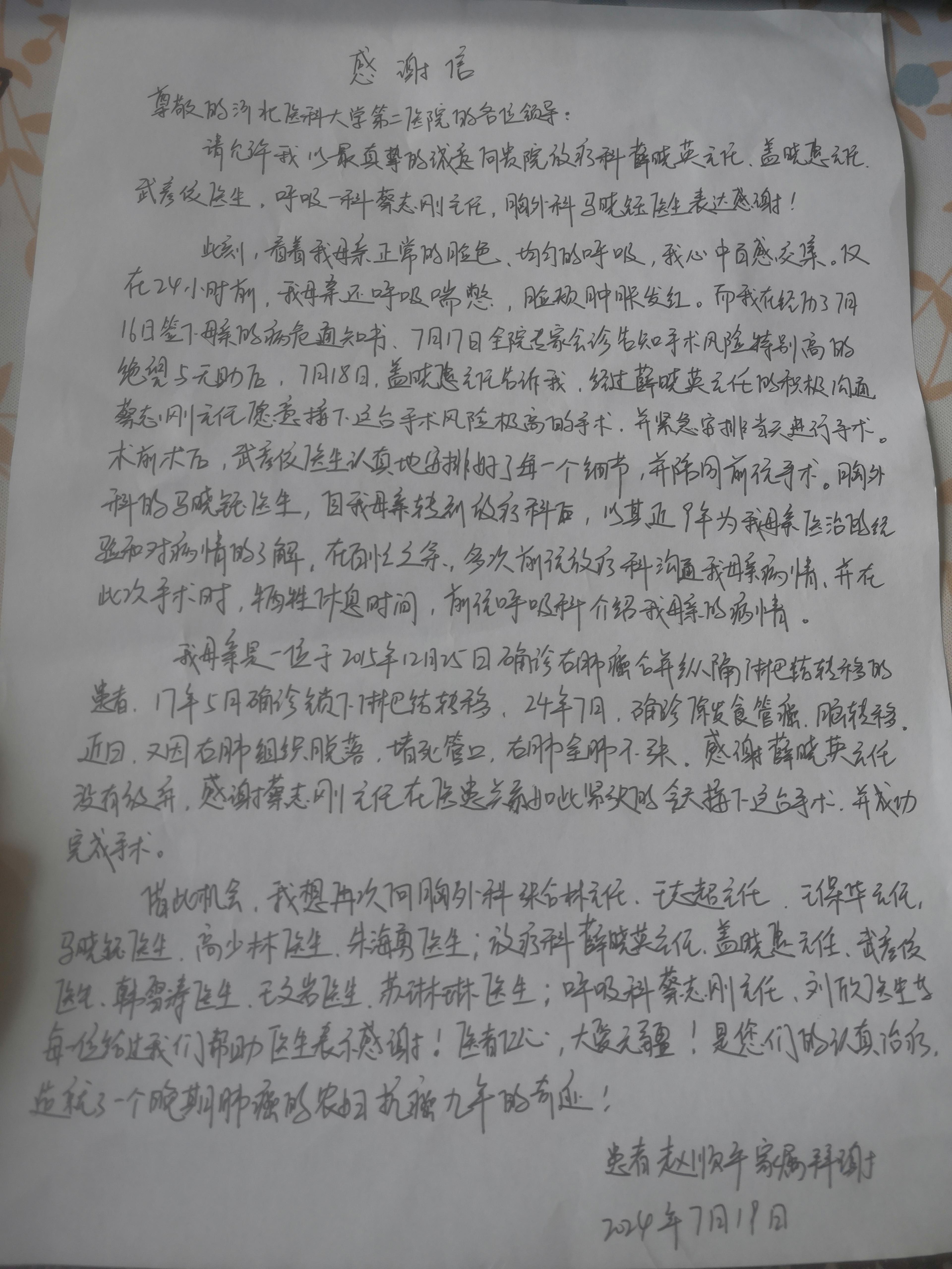 致我院放疗科、呼吸内一科、胸外科医疗团队感谢信