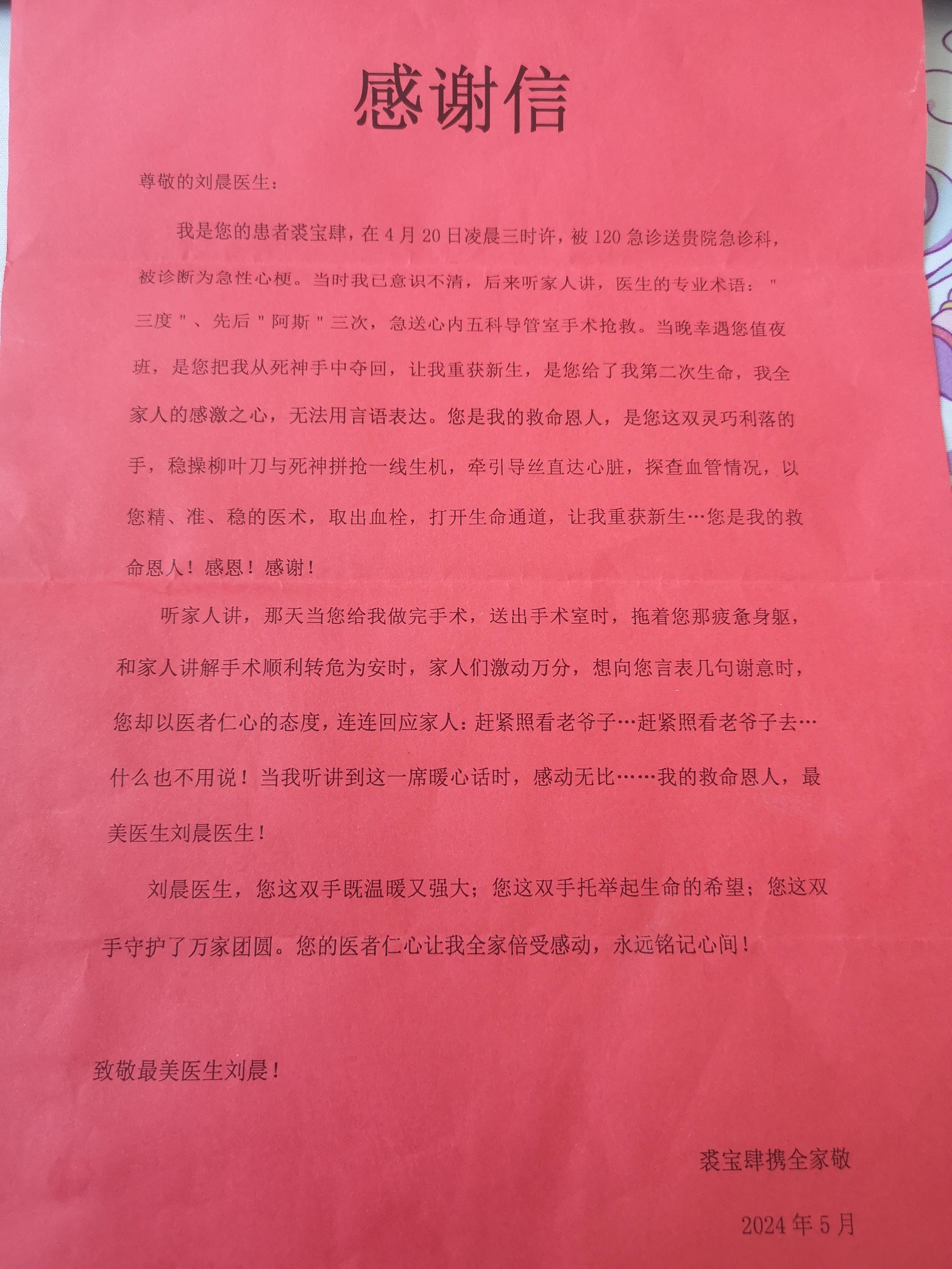 致心内五科刘晨医生感谢信