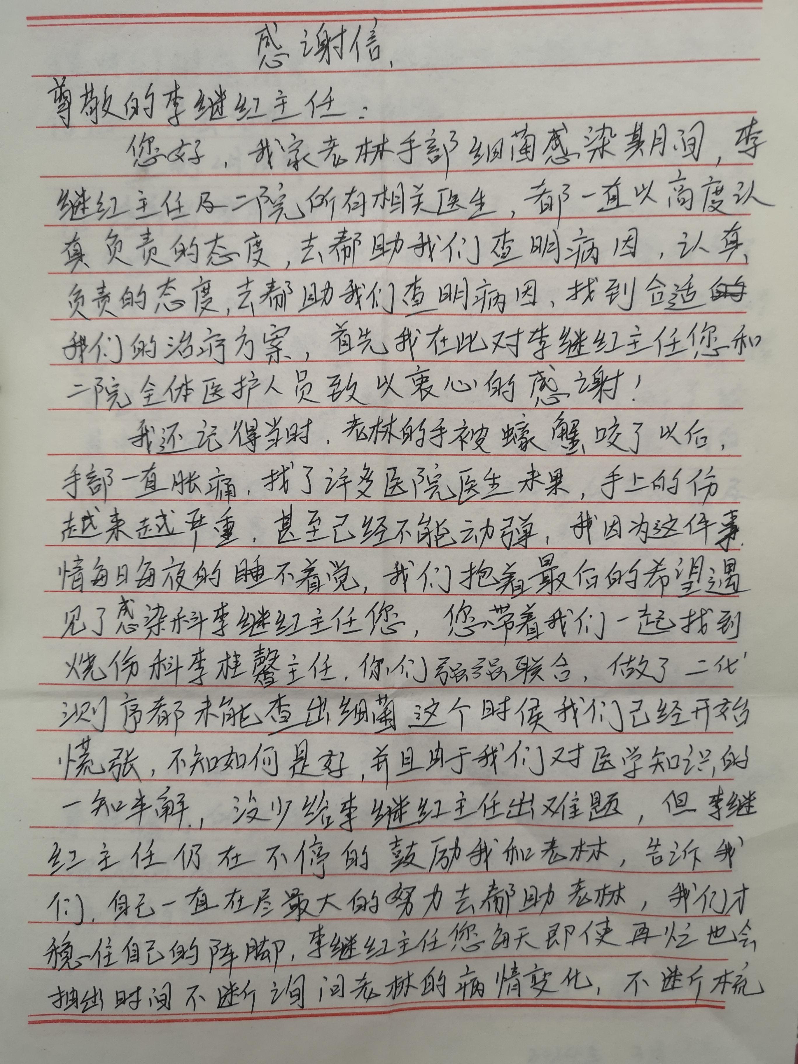 致感染性疾病实验诊断中心李继红主任及烧伤科李桂馨主任的感谢信