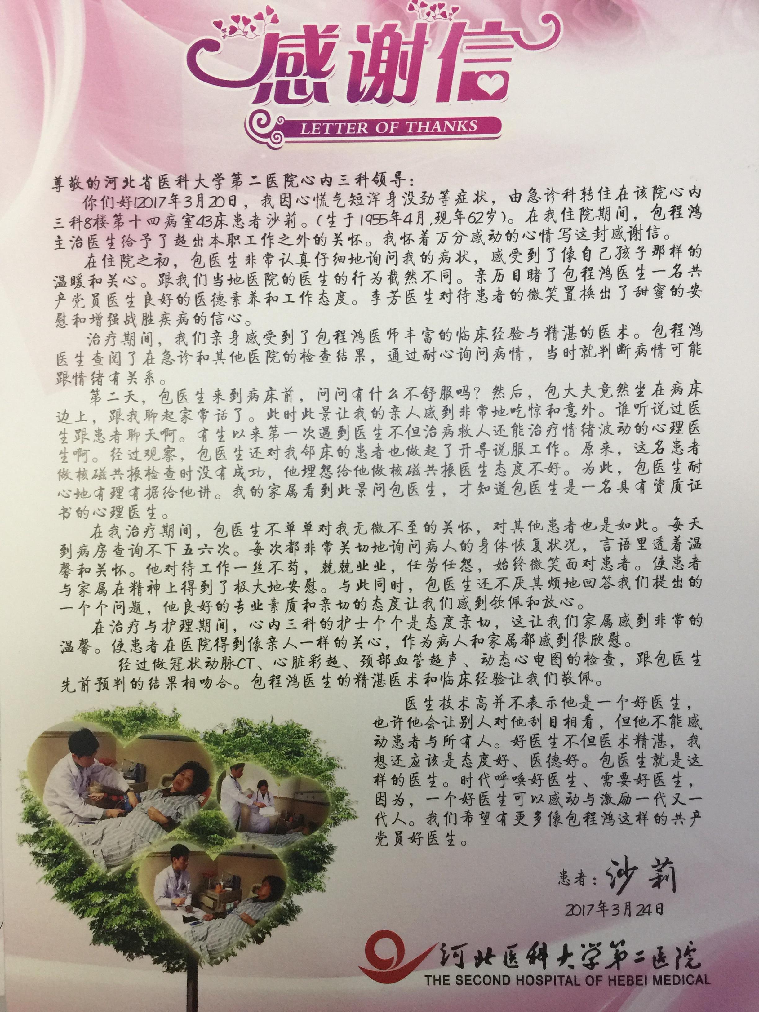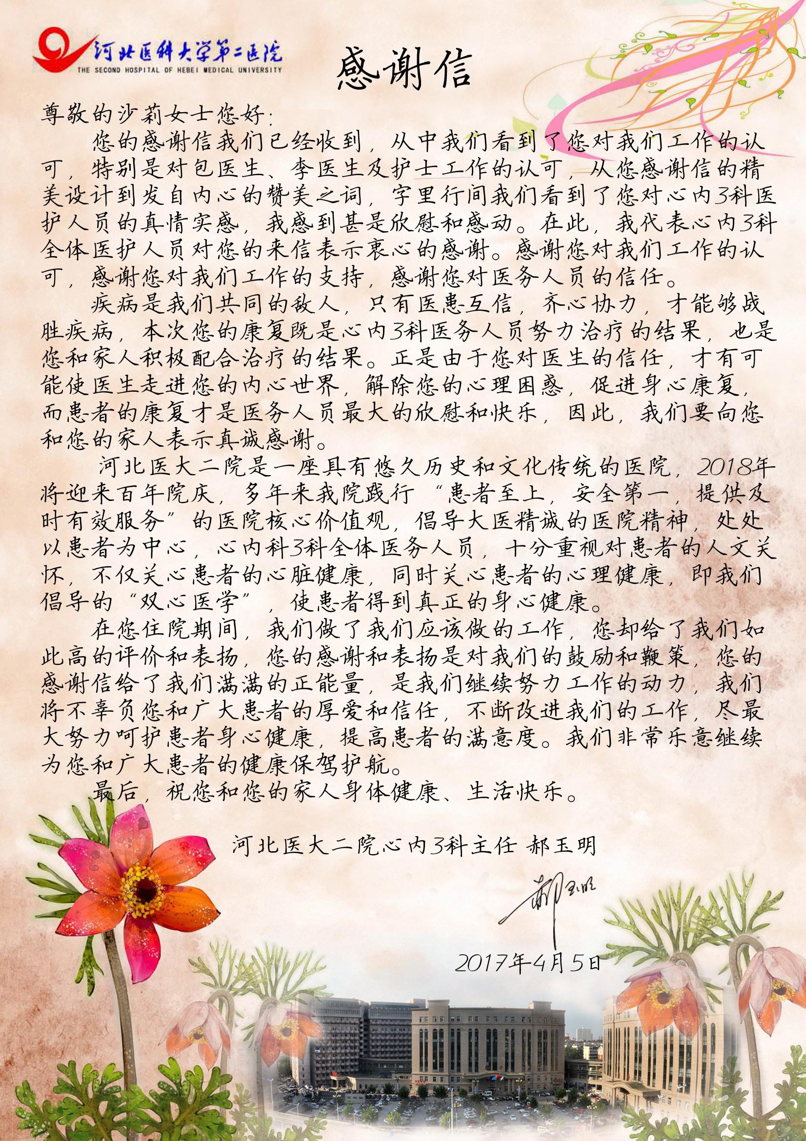 心内三科回谢患者的感谢信