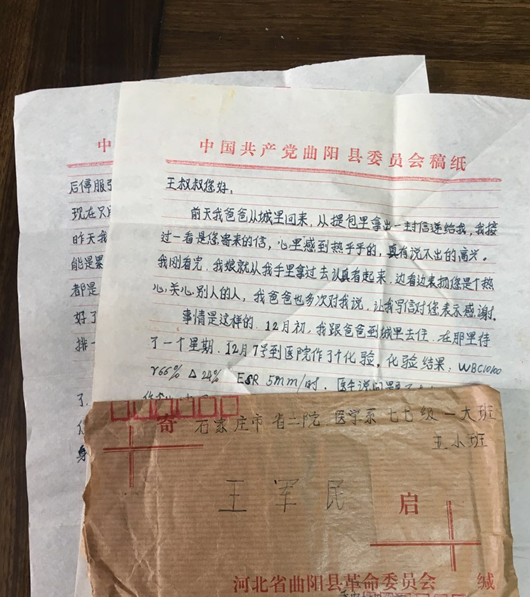 记得是一个发热待查的14岁的女孩儿,家住在河北省曲阳县产德公社东相如大队,在当地检查治疗很长时间,也未能明确诊断,辗转来到省二院等待了很长时间才住进了小儿科,我是实习生,代教是杨老师,在老师的带领下我们对患儿进行了详细的问诊和体格检查,充分利用教学医院的资源优势,经过科内会诊***终考虑是风湿性疾病,住院期间患儿和父母思想压力很大,担心是红斑狼疮,我亲自带着患儿去做各种检查,鼓励她,安慰她,还给她找来书籍,经过我们的精心治疗和热情关怀,患儿体温恢复正常,我们给她制定了长期的治疗方案,出院后一直通过写信了解患儿的病情并给予指导,使患者重新回到了学校。现在我就把小姑娘36年前给我的几封来信,特摘录如下,和大家一起分享!