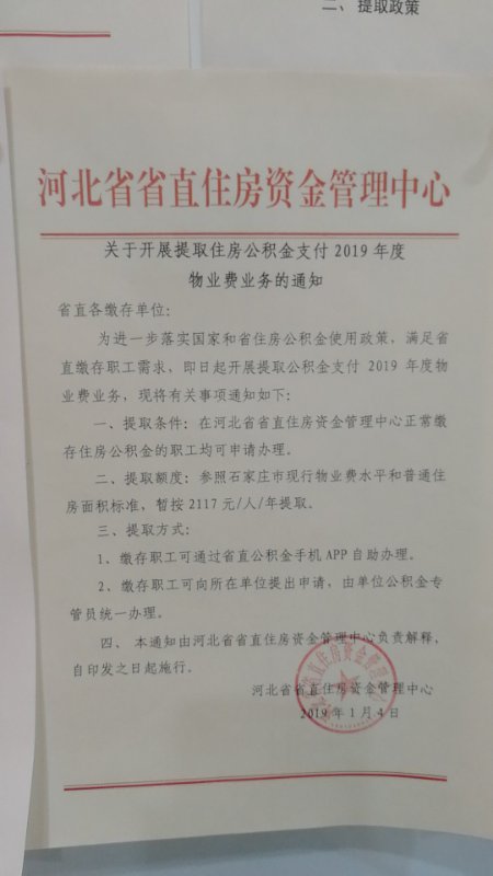 接河北省省直住房资金管理中心通知:为进一步落实国家和省直住房公积金使用政策,满足省直缴存职工需求,即日起开展提取公积金支付2019年度物业费业务.在河北省省直住房资金管理中心正常缴存住房公积金的职工均可申请办理;参照石家庄市现行物业费水平和普通住房面积标准,提取额度暂按2117元/人/年提取。