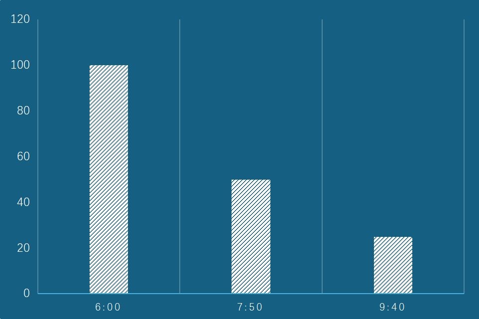 18F-FDG是一种最常用的放射性核素药物,既然是放射性核素药物,就有半衰期。半衰期是指放射性核素药物衰变掉一半所需要的时间。18F-FDG的半衰期是110分钟。举个例子,如果早晨六点钟100mCi的18F-FDG送达核医学科,那么到七点五十分18F-FDG剩下50mCi,到九点四十分剩下25mCi,到11点半剩下12.5mCi(如下图,横坐标代表时间,纵坐标代表放射性核素剂量)。