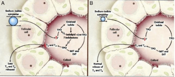 1. 保护机制失效:正常情况下,甲状腺遇到过量碘会自动"罢工"(医学称Wolff-Chaikoff效应),但某些人这个保护开关会失灵。(图示:碘化钠同向转运体表达的急剧减少导致碘转运减少,随后甲状腺激素合成恢复。)