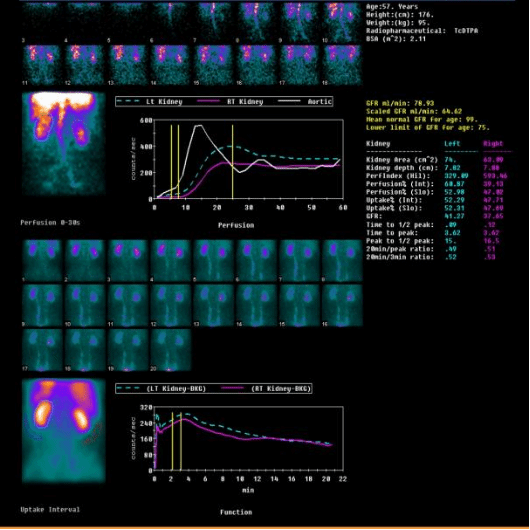 静脉注射经肾小球滤过或肾小管分泌的显像剂后,用核医学成像设备快速动态采集,获得肾脏血流灌注影像、肾实质影像,随后显像剂随尿液流经肾盏、肾盂和输尿管到达膀胱的序列影像,来观察肾脏的位置、大小、形态、功能和上尿路通畅情况,特别是能定量测定分肾功能(左、右肾的各自功能)。