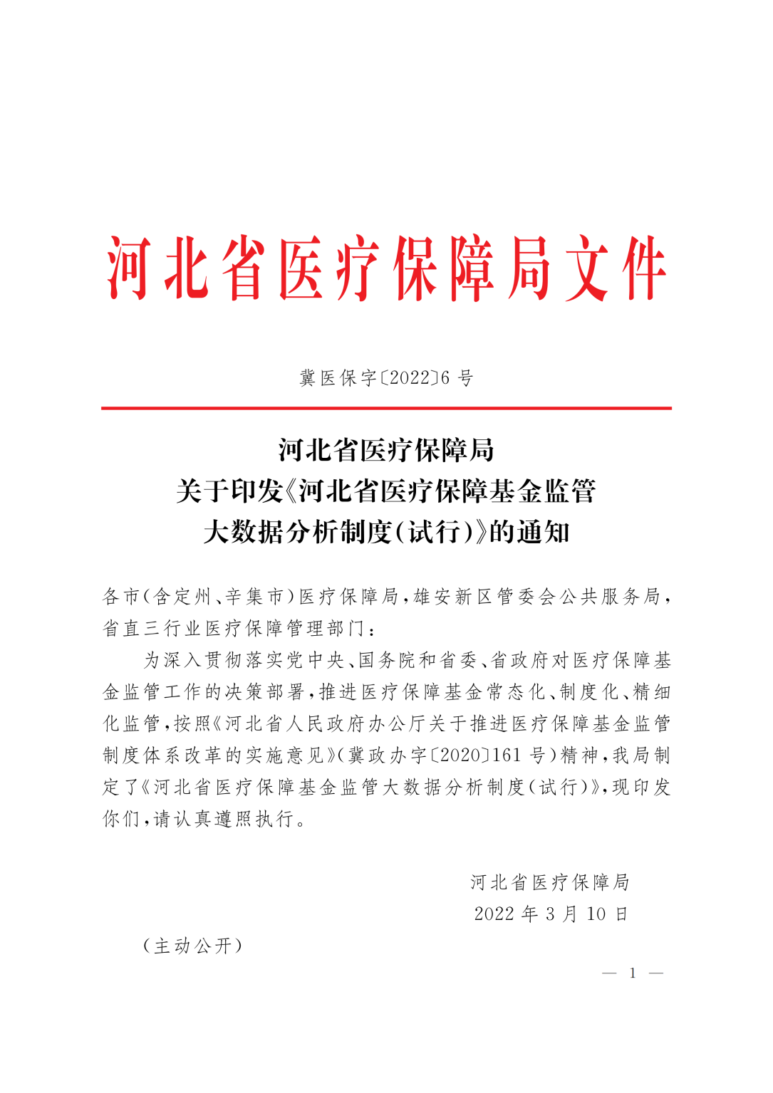 河北省医疗保障局关于印发《河北省医疗保障基金监管大数据分析制度(试行)》的通知