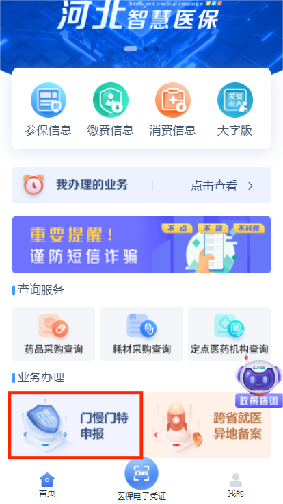 STEP02登录账号后,点击进入业务办理处的门慢门特申报板块。