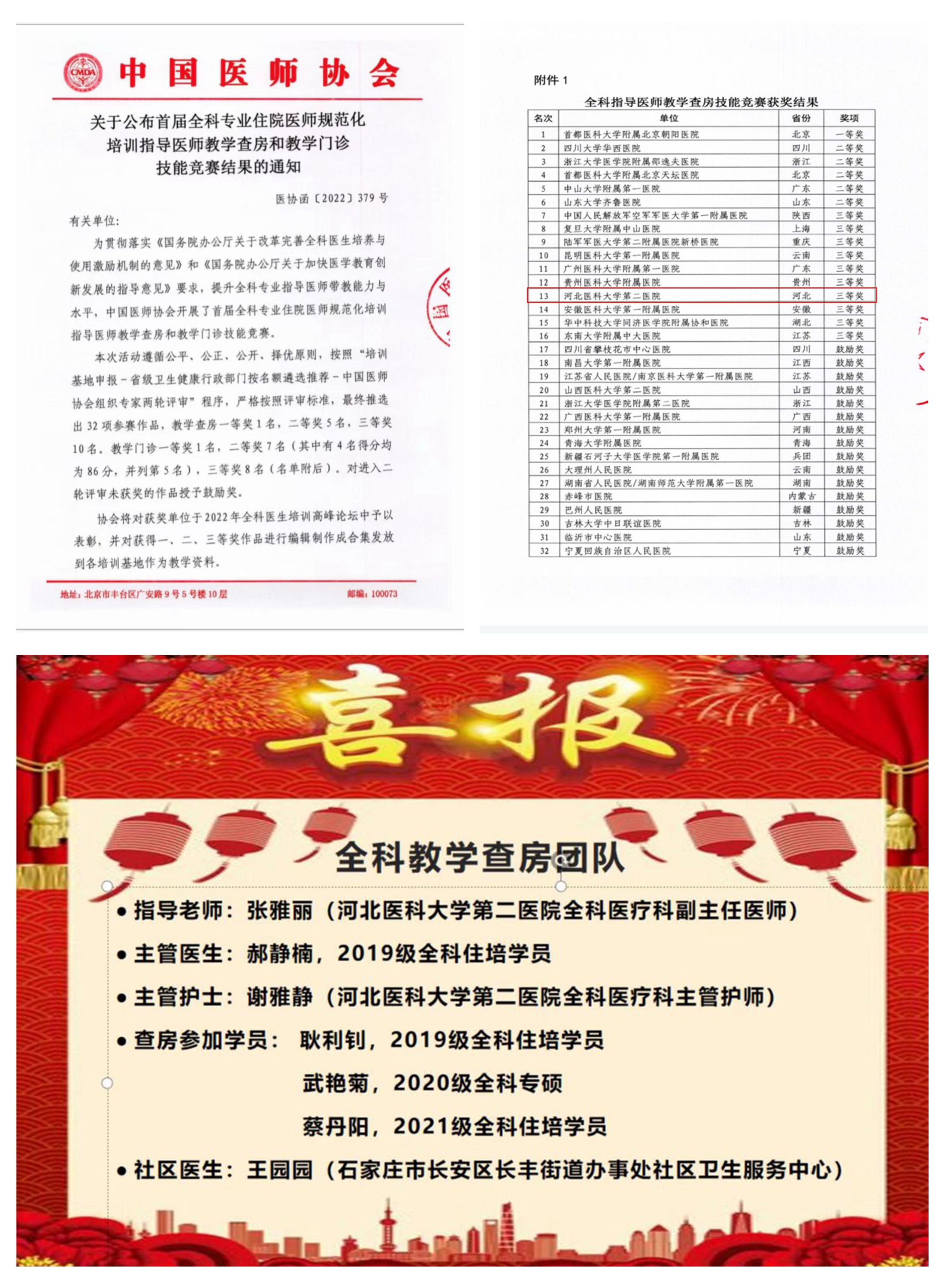 为贯彻落实《国务院办公厅关于改革完善全科医生培养与使用激励机制的意见》和《国务院办公厅关于加快医学教育能力创新发展的指导意见》要求,提升全科专业指导医师带教能力与水平,中国医师协会举办了首届全科专业住院医师规范化培训指导医师教学查房和教学门诊技能竞赛。经过激烈的角逐,我院全科住培基地张雅丽老师团队获教学查房技能竞赛三等奖(位居全国第十三)。