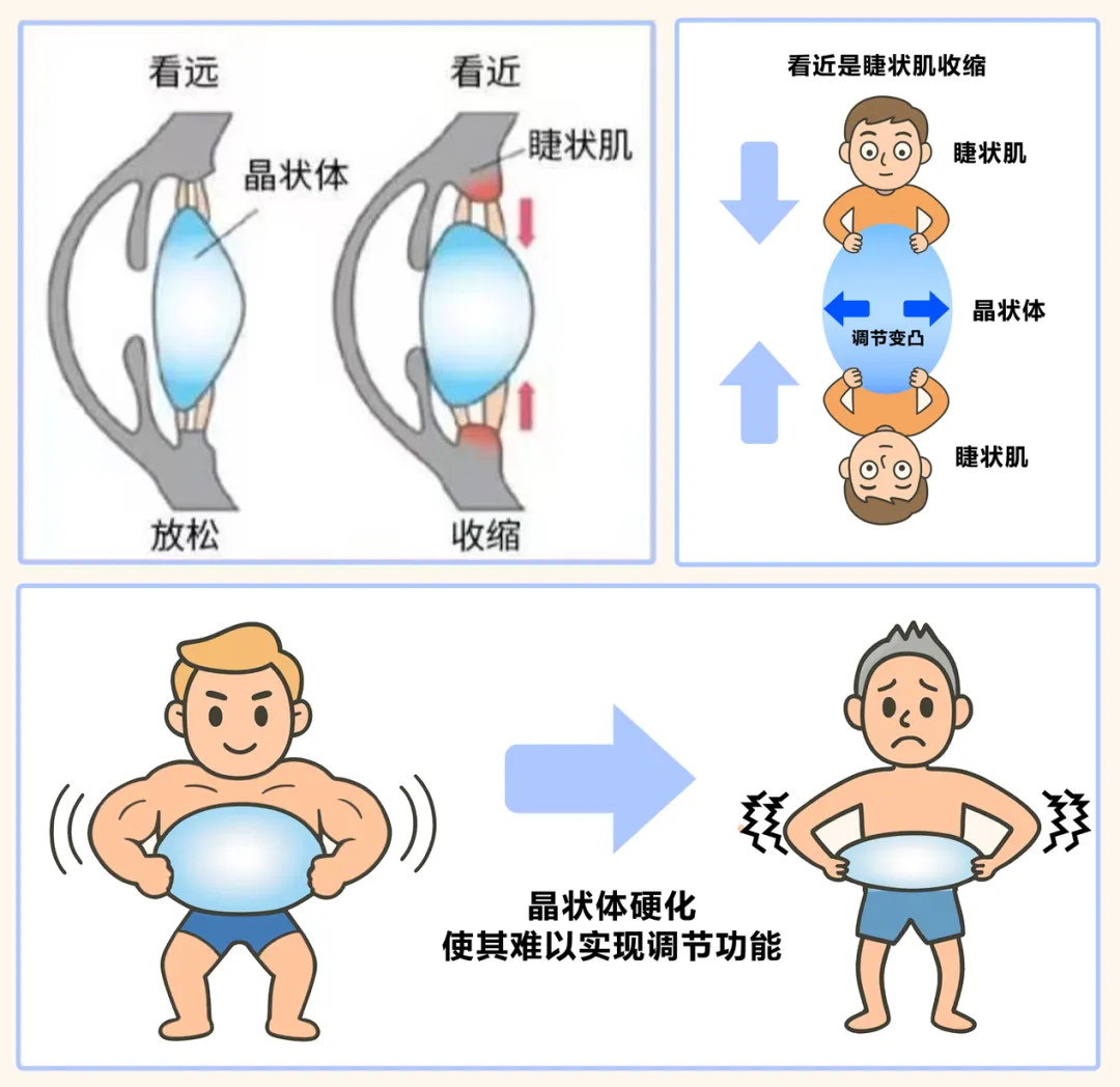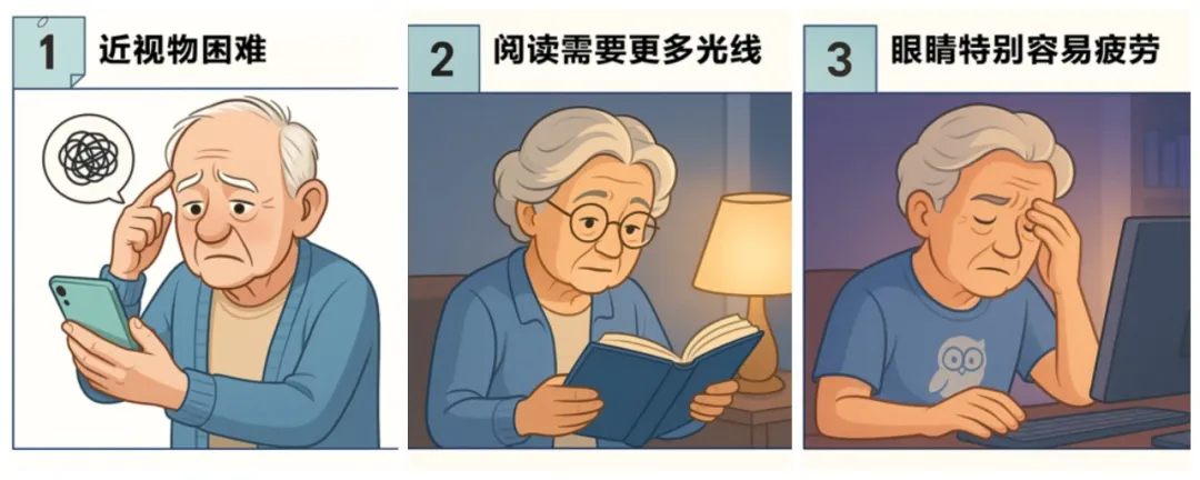 随着年龄的增长,晶体逐渐失去弹性,眼睛的“调焦能力”开始下降,无法像以前那样快速调节看近看远的焦距,导致我们在看近物时变得费劲,这个现象就叫做“老花眼”。如果同时伴有近视、远视以及散光,就会出现看近看远均模糊的现象,需反复摘戴眼镜,影响生活质量和工作效率。