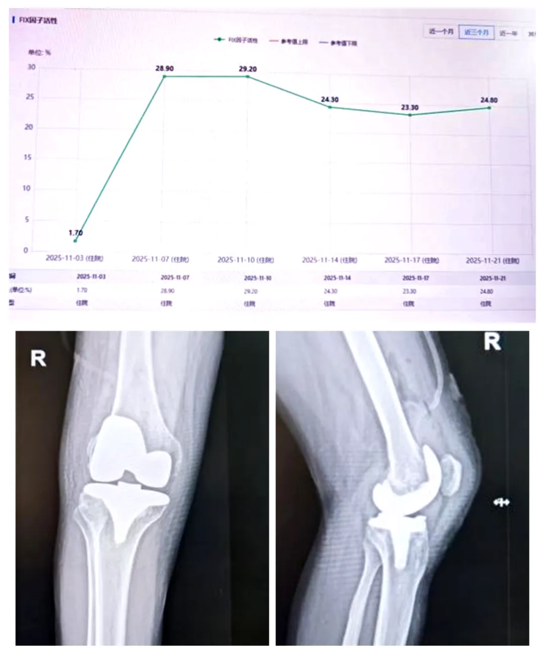 34岁的李先生,因血友病B型长期受膝关节反复出血困扰,疼痛加剧,严重影响生活。经术前凝血因子精准替代治疗、术中精细操作与止血、术后系统康复,患者顺利完成膝关节置换。术后一个月,疼痛显著缓解,关节功能逐步恢复。