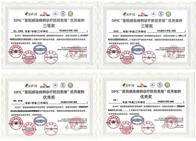在第21届上海国际医院感染控制会议、全球华人临床微生物暨感染学会学术年会上,我院报送的4份“医院感染病例诊疗防控思维”案例从全国218份案例中脱颖而出,其中《1例口底鳞状细胞癌术后深部切口感染的调查》《 1例胰十二指肠切除术后腹腔感染案例分析》荣获三等奖,《1例脑出血患者的诊疗与VAP分析》和《肾移植术后深部手术切口感染继发多部位感染的案例分析》获优秀奖,我院荣获优秀组织单位奖。