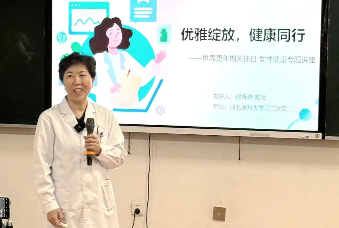 为迎接10月18日“世界更年期关怀日”,10月15日,我院妇科一病区医护团队走进河北老年大学,举办“优雅绽放,健康同行”女性健康专题讲座。此次讲座由我院徐春琳教授、杜辉教授及其团队主讲,采取线下讲座与线上直播相结合的形式,全方位、多维度地普及更年期健康管理知识。