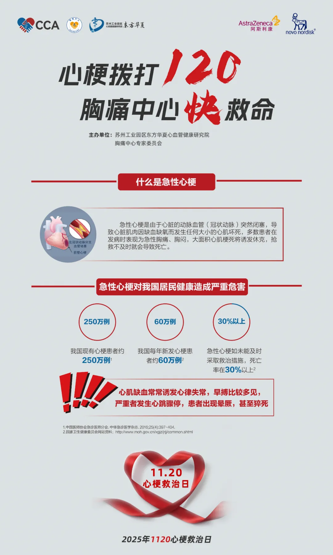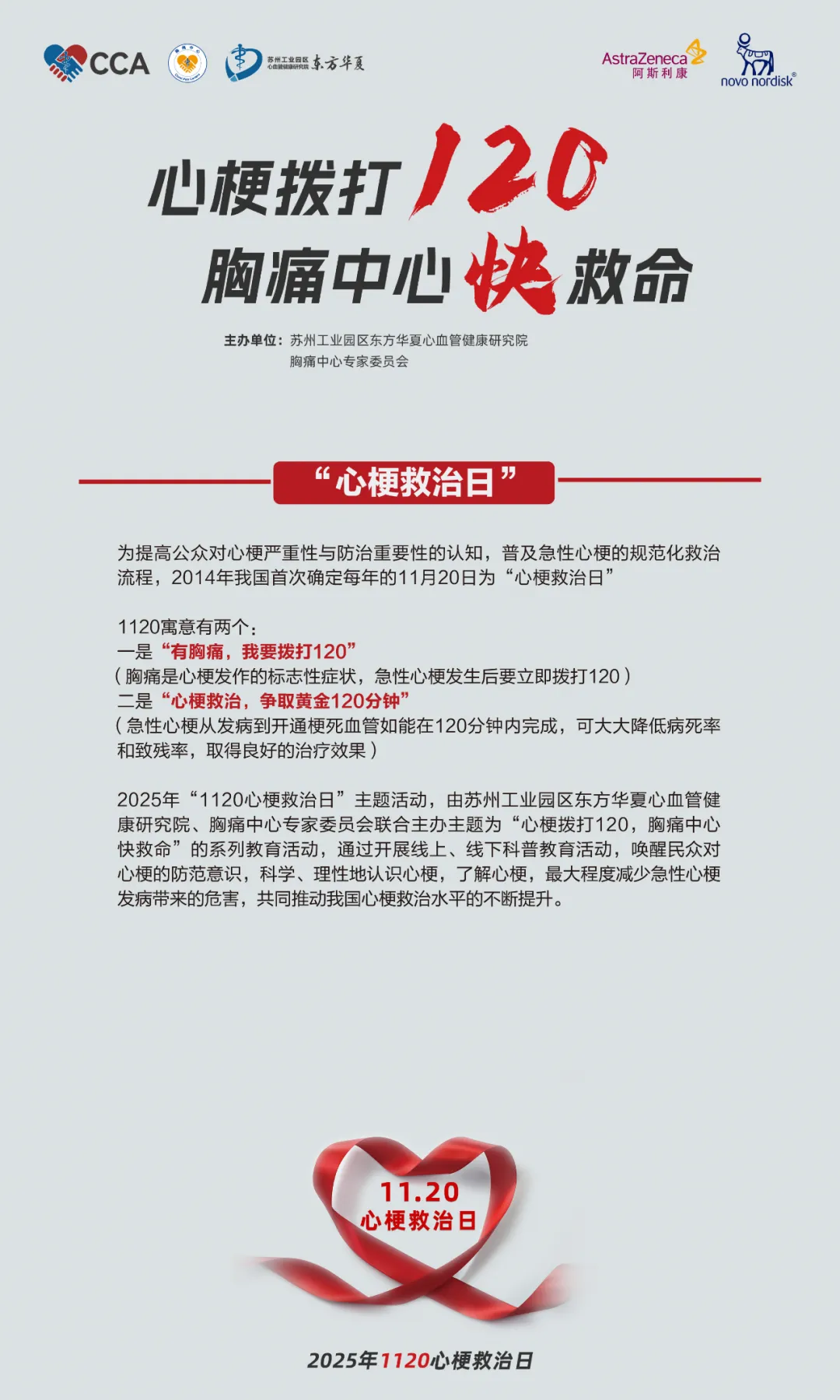 为提高公众对急性心肌梗死严重性与防治重要性的认知,普及急性心梗的规范化救治流程,中国医师协会于2014年成立了“心梗救治日”,确定每年的11月20日为“中国1120心梗救治日”。