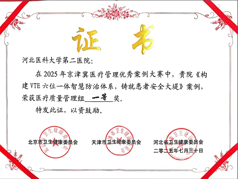 本次大赛由京津冀三地卫健委主办,以“智慧医管·创享未来”为主题,聚焦医疗质量管理、改善医疗服务、科技创新实践等核心议题。比赛中,我院医务处张兰英副处长以其精心准备的医疗管理案例《构建院内VTE六位一体智慧防治体系,铸就患者安全大堤》为核心,配合逻辑严谨、感染力十足的精彩演讲,从众多参赛项目中脱颖而出,勇夺大赛一等奖。该案例聚焦医院VTE管理,展示了我院在VTE智慧管理方面的创新性、解决方案及取得的显著实效,获得评审专家高度评价。