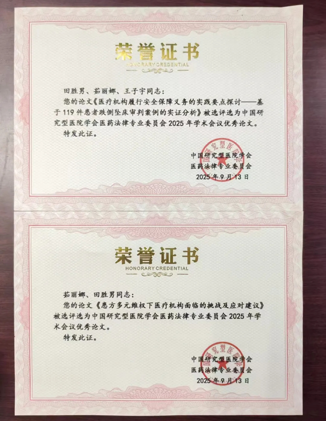 在大会组织的“医疗服务与管理的法治保障暨医疗纠纷预防与处理的新路径”论文征集活动中,我院田胜男等撰写的论文《医疗机构履行安全保障义务的实践要点探讨--基于119件患者跌倒坠床案例》,茹丽娜等撰写的论文《患方多元维权下医疗机构面临的挑战及应对建议》,从百余篇作品中脱颖而出,获评2025年度优秀论文。