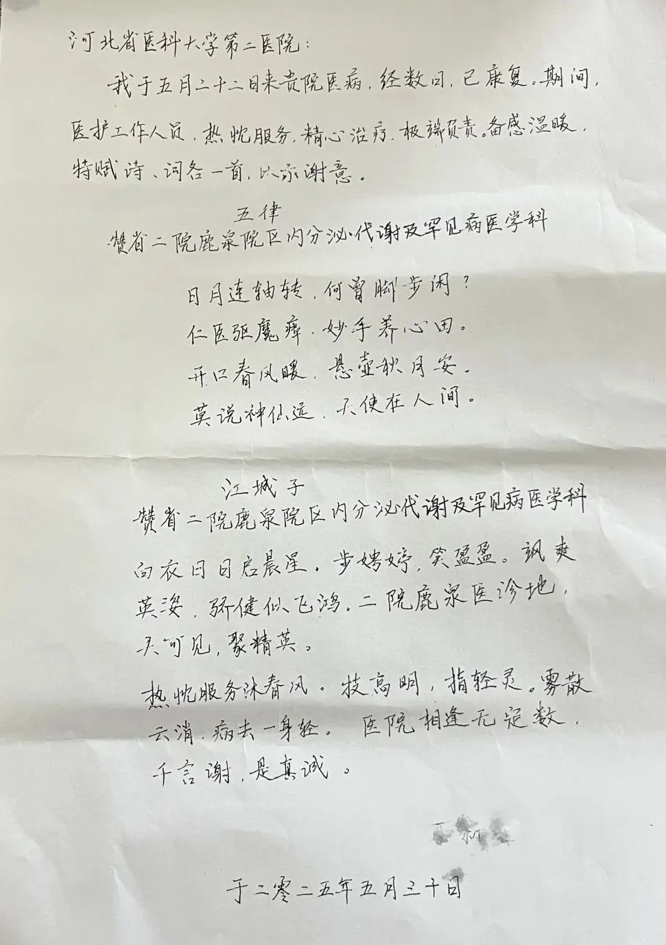 腹有诗书气自华。丁先生对治疗效果非常满意,特别向鹿泉院区内分泌代谢及罕见病医学科全体医护人员手书感谢信,赋诗称赞医护人员医术精湛,充满人文关怀,让他在治疗过程中倍感温暖与安心。