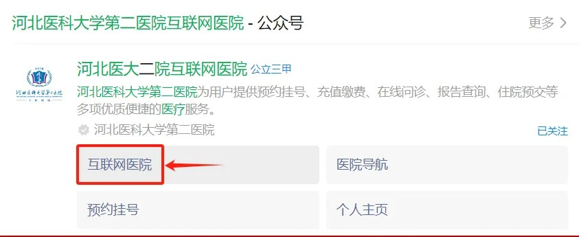 或关注“河北医科大学第二医院互联网医院”公众号,点击“互联网医院”。