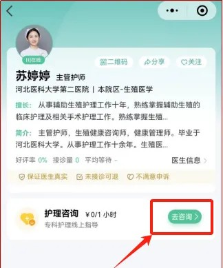 3.选择专家: 选择咨询科室 -> 选择护士 -> 点击“去咨询”。