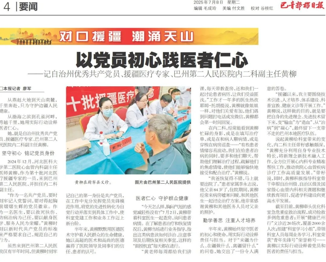 2024年12月,河北医科大学第二医院心血管内科副主任医师黄柳,作为第十批河北医疗援疆专家的一员,来到巴州第二人民医院,并担任内二科副主任。