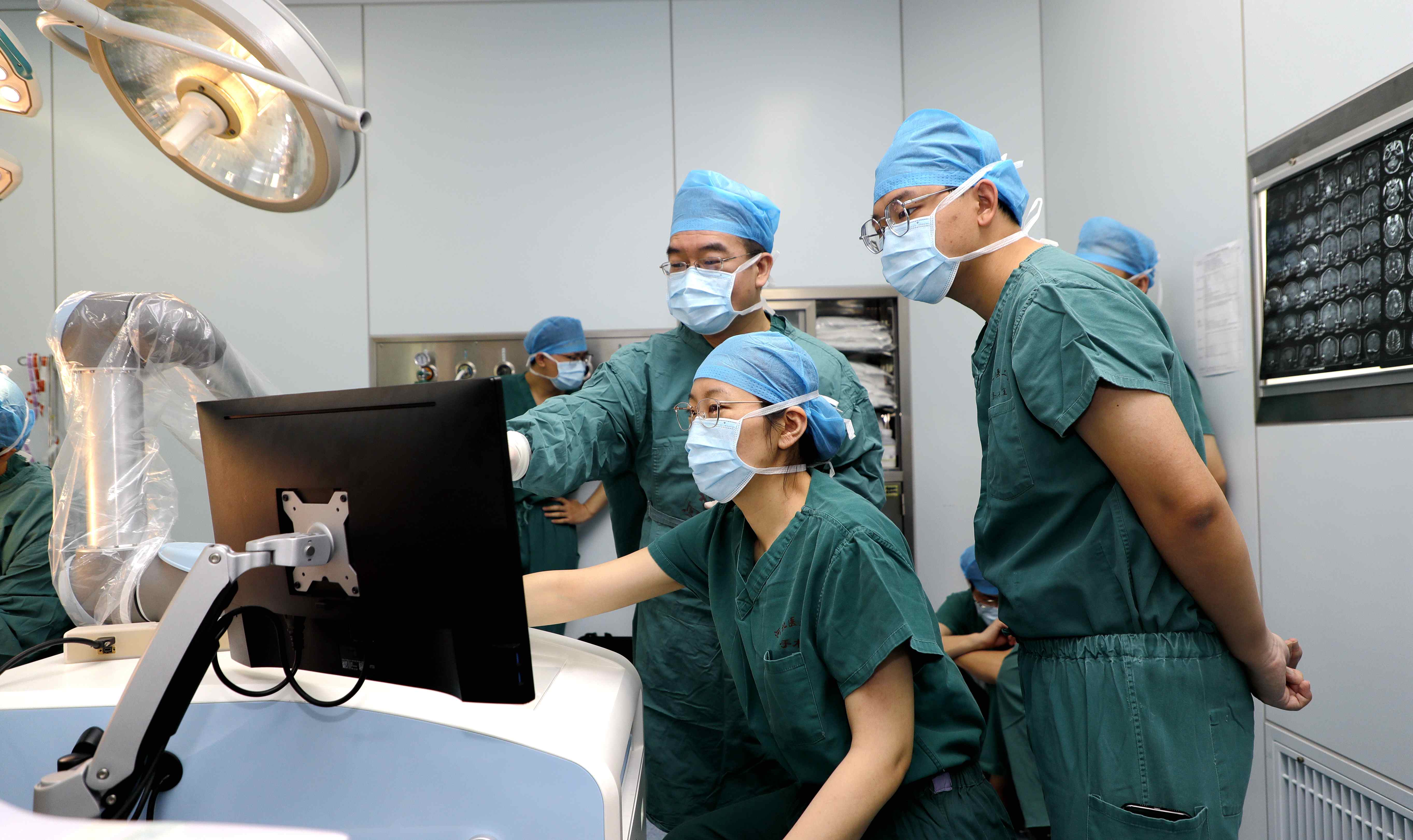 经过严谨的设备调试和周密的术前准备,在副院长郭力、赵宗茂的指导下,神经内科檀国军、李彬主任医师及贾珍主治医师、神经外科主任医师刘力强等专家借助神经外科手术机器人顺利完成了手术,手术时长不到30分钟。